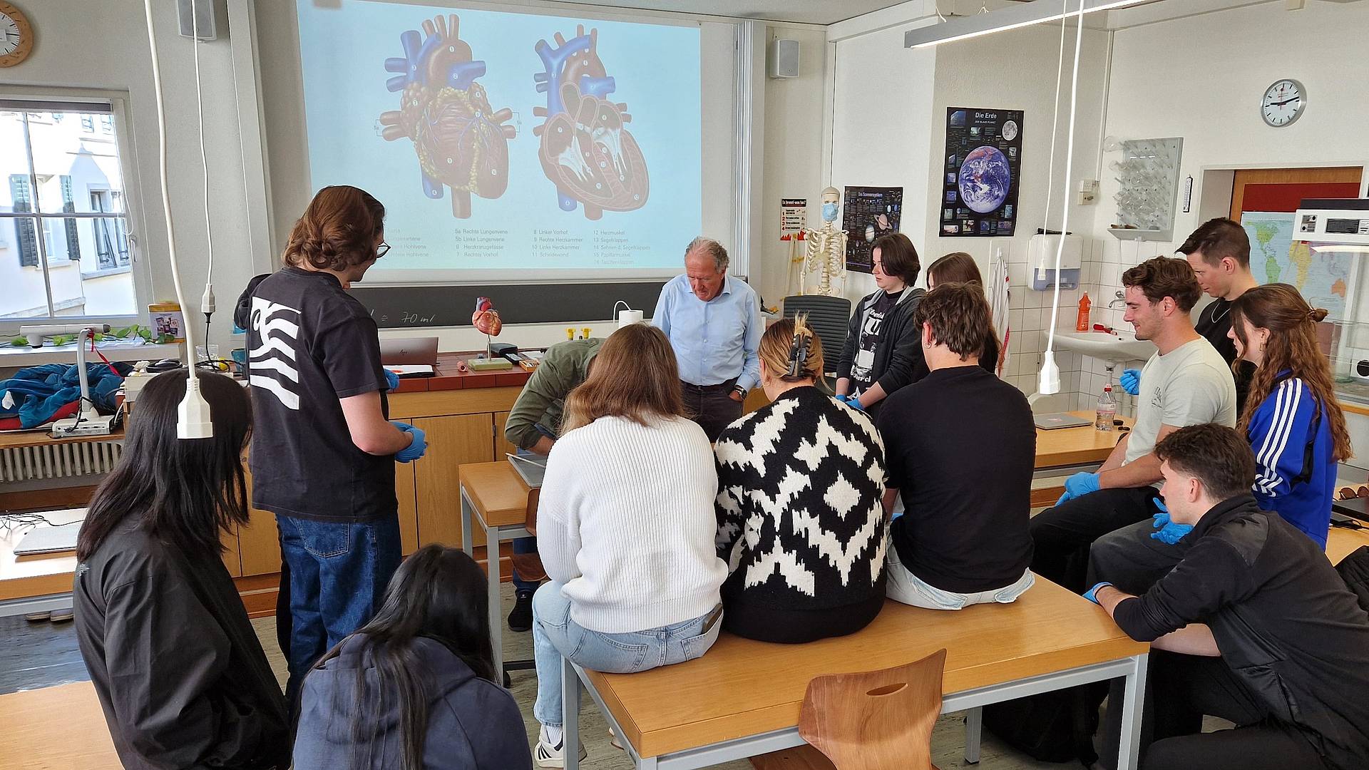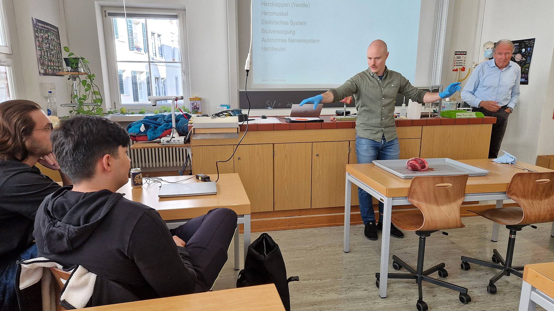 Bei dieser Unterrichtseinheit schlägt das Herz der Berufsmaturitätsschülerinnen und -schülern höher: Lehrperson Silvio Widmer nutzt ein echtes Rinderherz, um seinen Lernenden die Funktionsweise des Herzens näherzubringen. Unterstützt wird er dabei von Dr. med. Fritz Widmer, Facharzt für Kardiologie, der unter anderem typischen Risikofaktoren für Herz-Kreislauf-Erkrankungen erklärt.