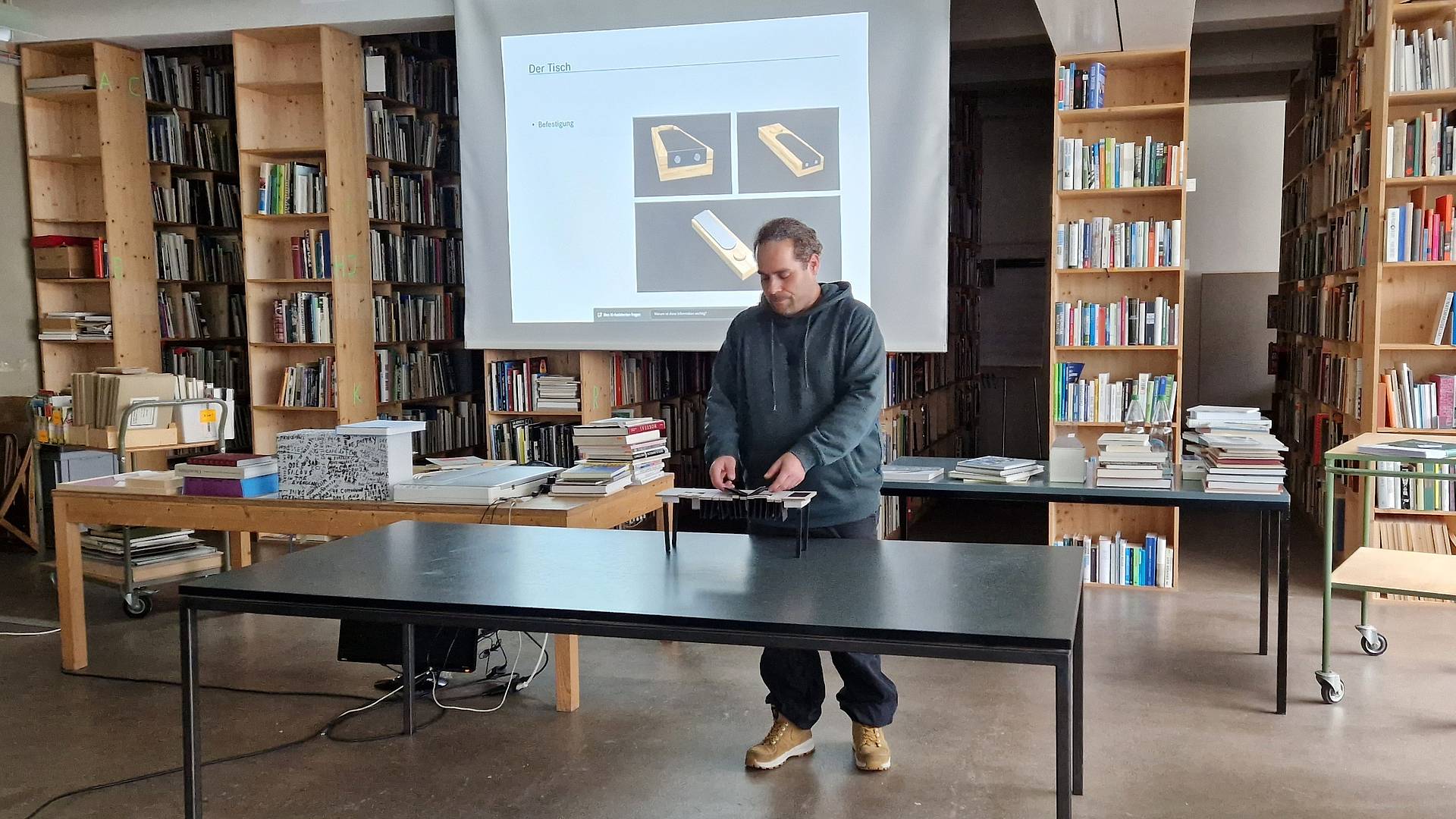 Industrial Designer Stefan Gmür stellte einen multifunktionalen Arbeitstisch mit 16 Ordnern nach Telefonbuch-Prinzip, integriertem Bildschirm und Platz für Laptops vor. «Die Installation lädt Jung und Alt ein, Schnipsel analog zu durchstöbern und digital gezielt zu suchen», erklärt Stefan Gmür, der mit seiner Klasse bereits am «DigiCamp» der Interkantonalen Hochschule für Heilpädagogik teilnahm. Damals wurden interdisziplinär Lösungen für Alltagsprobleme bei komplexen Behinderungen gesucht und gefunden (mehr dazu).