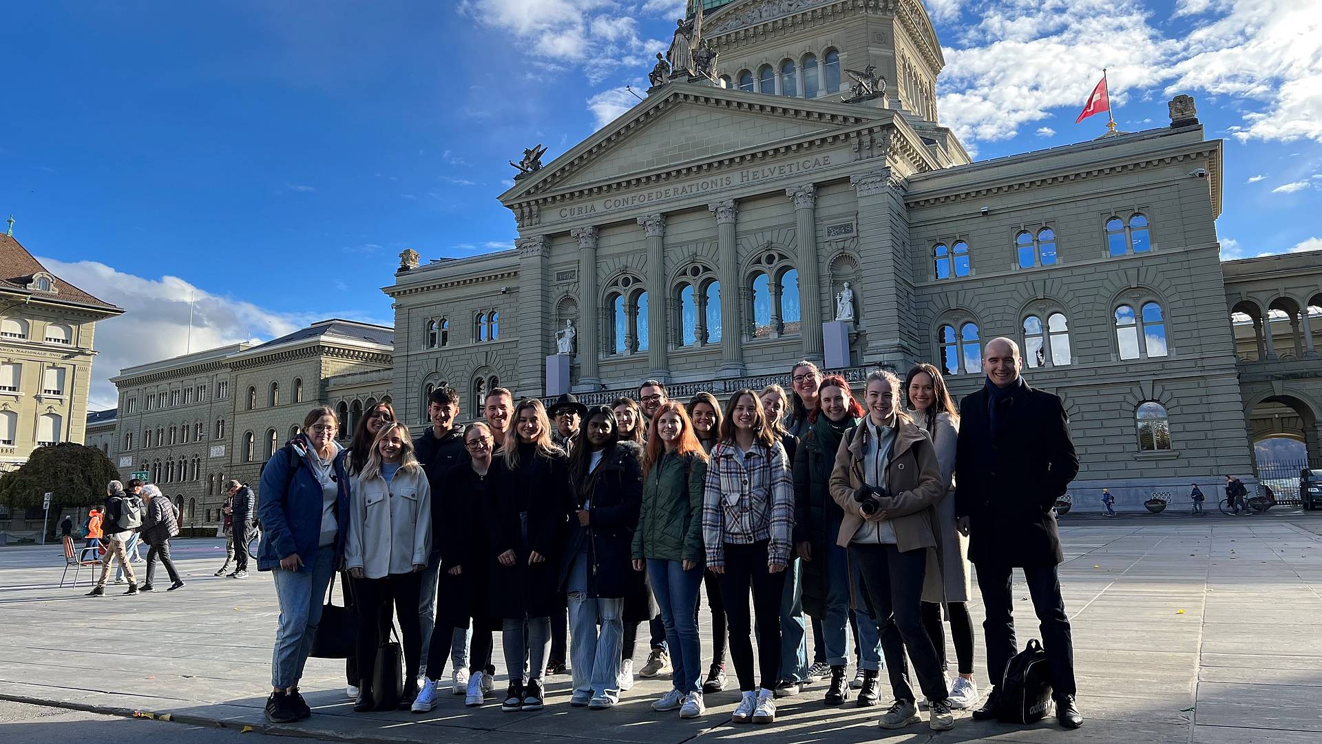Am 16. November 2022 reiste Geschichtslehrer Luc Hardmeier mit der BMS-Klasse BMGV1b ins Bundeshaus nach Bern. Im Rahmen des Politikunterrichts nahmen sie an einer Führung durch das Parlamentsgebäude teil, trafen einen Ständerat und durften ihm Fragen stellen. Die Schüler*innen wollten unter anderem seine Position zu Armee und Klimakrise wissen. Weshalb ging er überhaupt in die Politik? Und muss man immer auf Linie der Partei politisieren? Die Veranstaltung diente der Vertiefung des Unterrichts und stiess auf grosses Interesse. Alles in allem ein spannender Tag in der Hauptstadt der Schweiz.