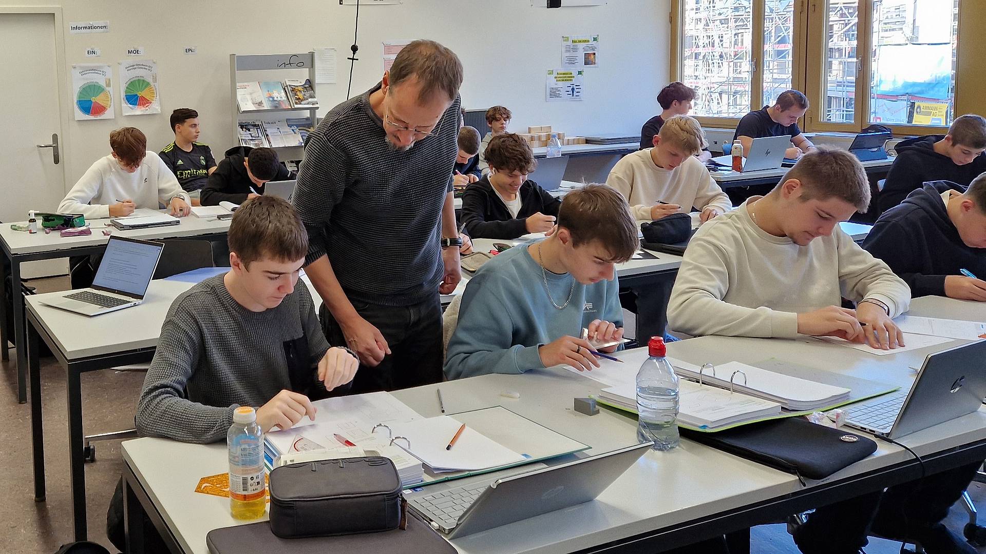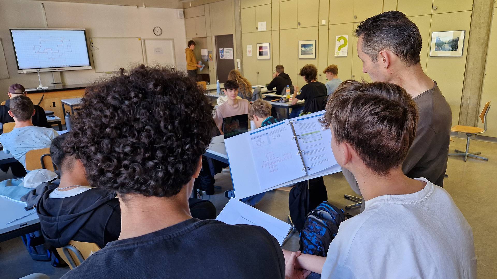 Es darf miteinander gesprochen werden, während die Lehrperson zwei Reihen weiter vorne auf eine einzelne Frage eingeht. «Solche Diskussionen finden auch im Berufsalltag statt», sagt Lehrperson Rolf Huwyler. Er unterrichtete die Automatiker während des Besuchsmorgen im Fach Zeichnungstechnik. Das Thema: Bemassung unsymmetrischer Formen.