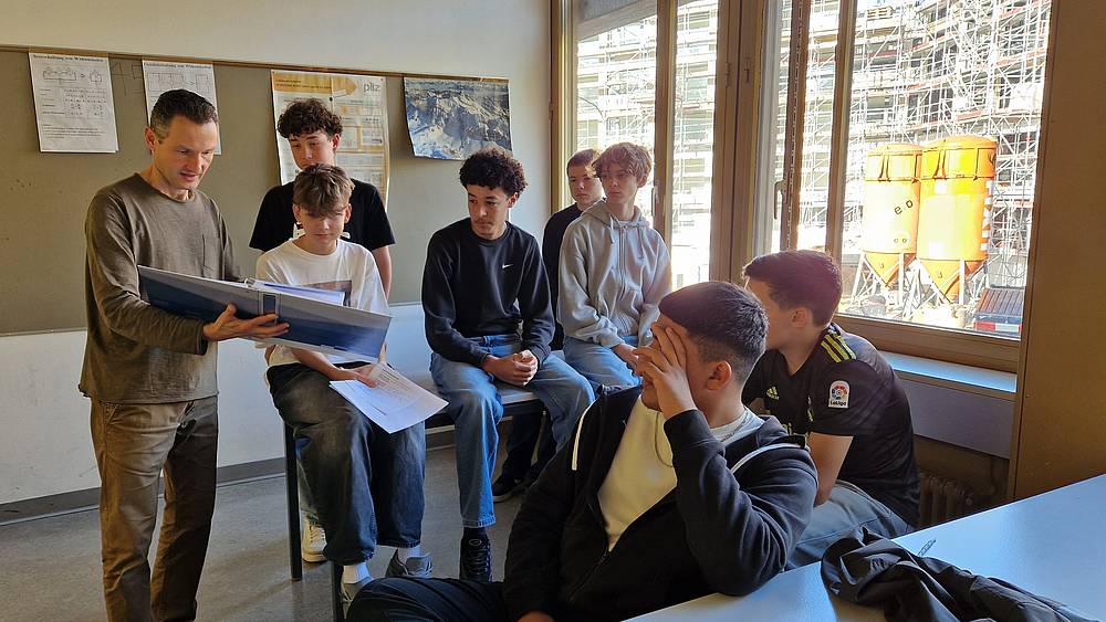 Rolf Huwyler nahm sich Zeit und blätterte mit den Oberstufenschüler/-innen durch das Lehrmittel. Er erklärte ihnen, wie wichtig es für die Zusammenarbeit ist, dass Automatiker ein Verständnis für die exakten Zeichnungsvorgaben der Konstrukteure haben.