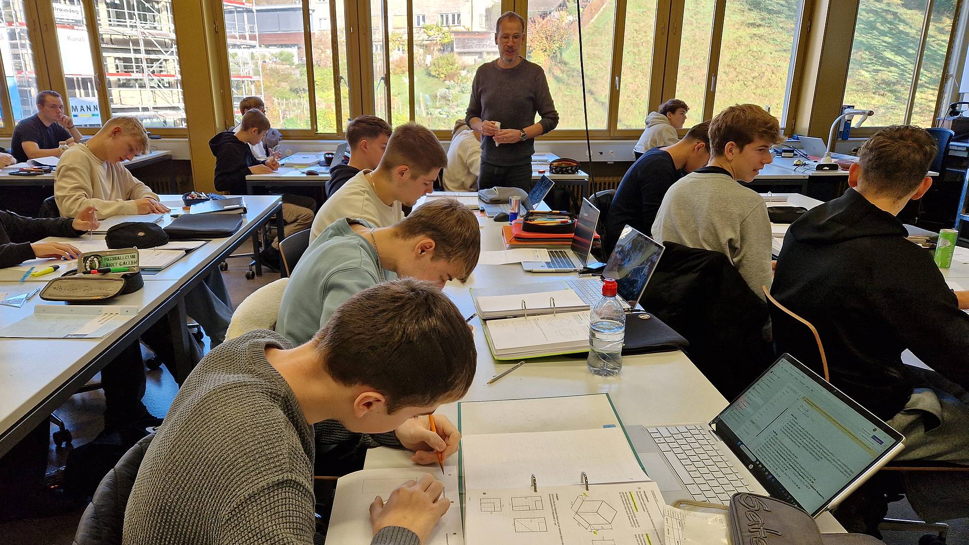 Wie unterscheidet sich der Unterricht an der Berufsschule im Vergleich zur Oberstufe? Als die Schüler/-innen aus dem Rheintal vorbeikamen, arbeiteten die angehenden Elektroinstallateure gerade am Fachzeichnen. Bei Christof Rietmann wurden Körper in der isometrischen Perspektive und in der Kabinettperspektive im Massstab 2:1 gezeichnet. Die Lernenden durften zuerst eine Viertelstunde lang konzentriert für sich an der Aufgabe arbeiten, danach besprach Christof Rietmann die Lösungen.