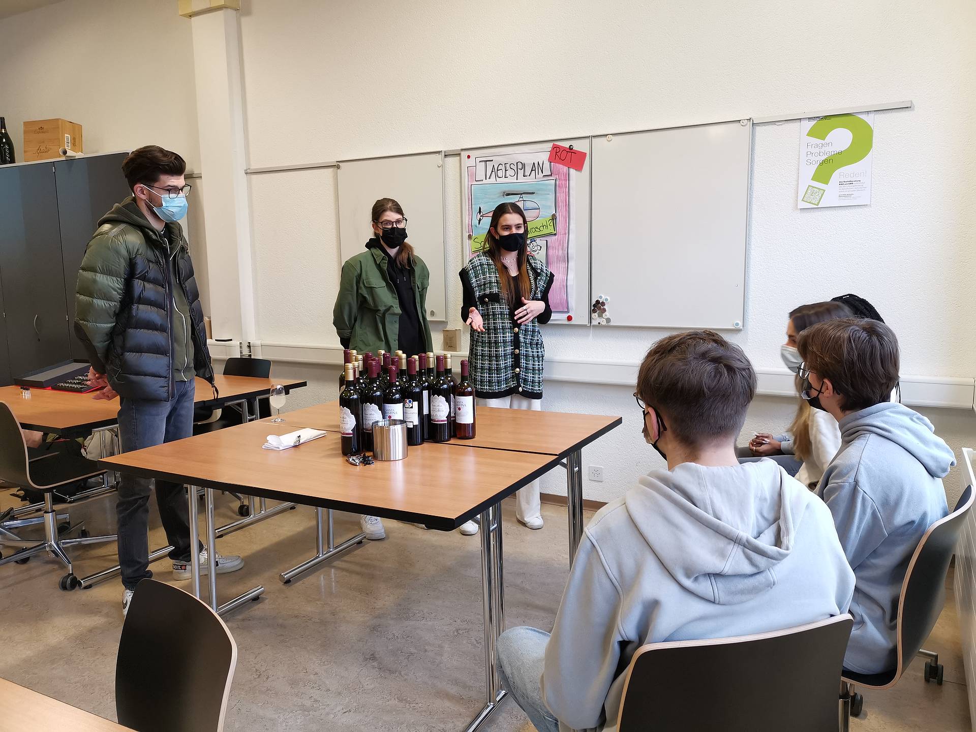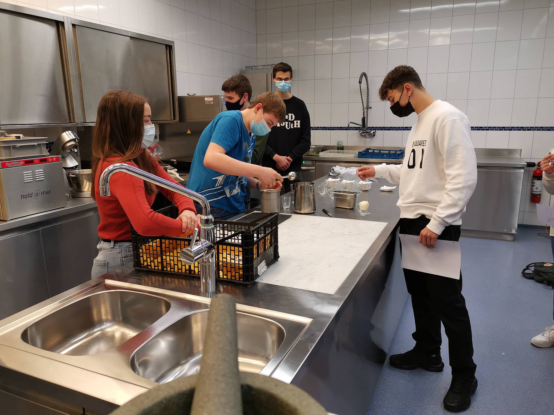 Für die Schülerinnen und Schüler geht es an diesem Morgen von Posten zu Posten. Für jede Station sind 20 Minuten eingeplant, so haben die Jugendlichen am Ende des Morgens fünf Berufsbilder näher kenenngelernt. Die Fachlehrpersonen erzählen von der schulischen Ausbildung, die Lernenden zeigen, was sie können. Und: Die Oberstufenschüler*innen probieren sich selber aus. So wartet bei der Station Restaurantfachmann/frau EFZ ein Parcours, den die Jugendlichen mit drei Tellern auf dem Arm bestreiten.