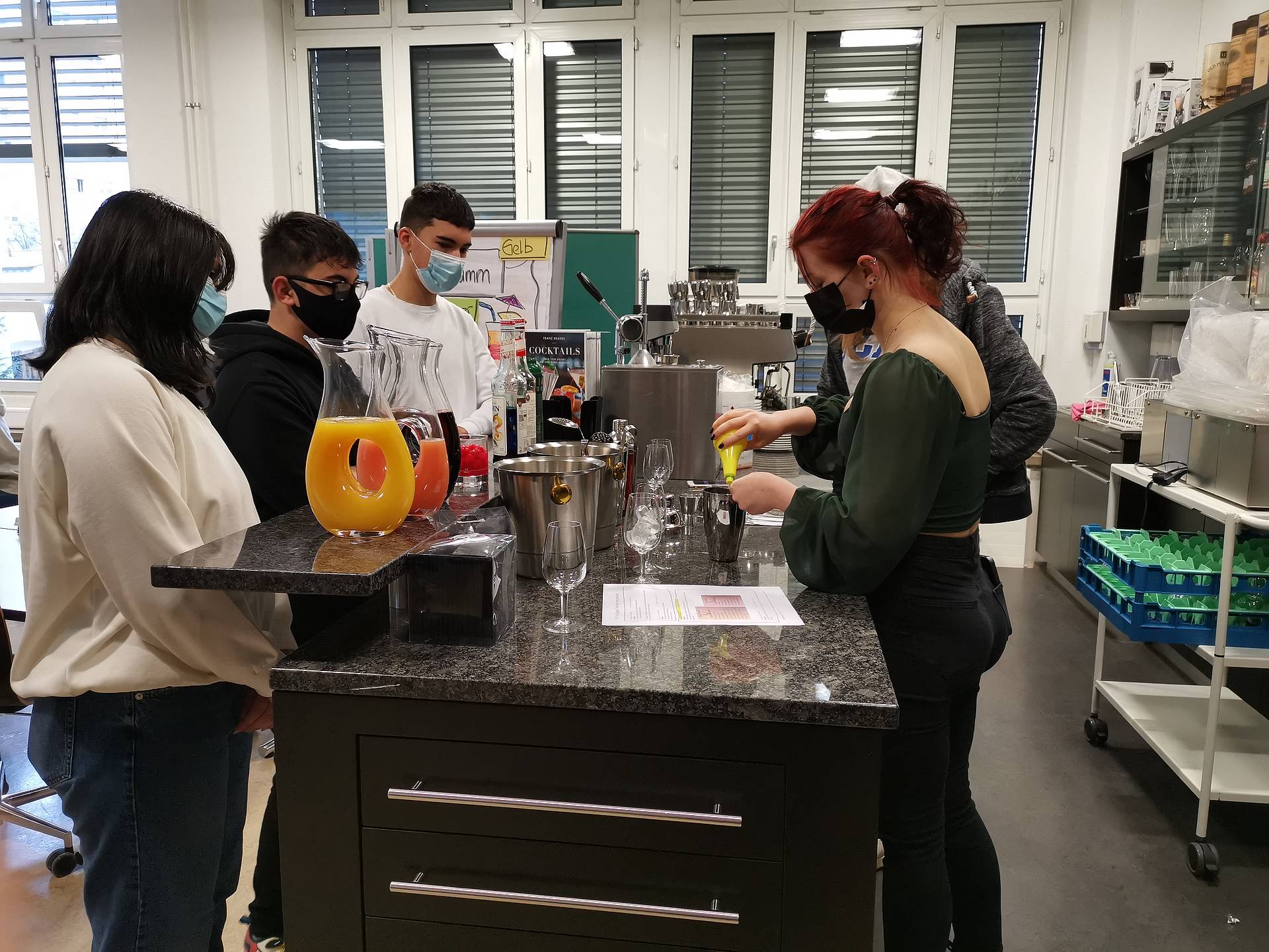 Gar nicht so einfach. Sie falten unter Anleitung der Lernenden selber Stoffservietten, mixen ihren eigenen Drink – alkoholfrei, versteht sich – und testen verschiedene Aromen und deren Wirkung aus. Die anfängliche Scheu ist schnell verflogen. Der direkte Austausch auf Augenhöhe zwischen Schüler und Lernenden funktioniert.