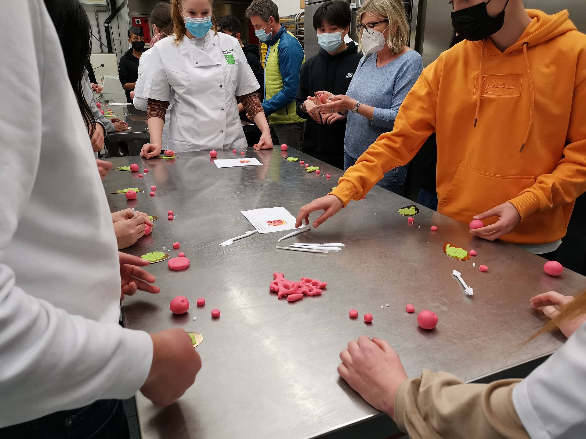 Ein Stock weiter oben erklären die angehenden Köchinnen und Köche, wie man ein gelungenes Menü von Vorspeise bis Dessert zusammenstellt und sie servieren selbstgemachtes Vanilleglace zum Degustieren. Bei der Station Bäcker/in-Konditor/in-Confiseur/in EFZ formen die Schülerinnen und Schüler ein Marzipan-Schweinchen, das sie als Souvenir mit nach Hause nehmen. Neben den Berufen aus dem Bereich Gastronomie werden an diesem Morgen der Beruf Coiffeur/euse EFZ und Zahntechniker/in EFZ vorgestellt. Dabei wird klar: Alle diese Berufe sind systemrelevant, die Karrieremöglichkeiten danach vielfältig. Die Jobsuche nach dem Abschluss sei für die Lehrabgänger*innen selten ein Problem, sagt Daniel Bösch, Leiter der Dienstleistungsabteilung am GBS. «Unsere Fachkräfte sind gefragt.» Mit dem Berufswahlmorgen am Grütli wolle man jungen Leuten die Chance geben, sich kurz und kompakt einen Überblick über diesen Berufszweig zu verschaffen. Der erste Anlass dieser Art soll denn auch nicht der letzte gewesen sein.