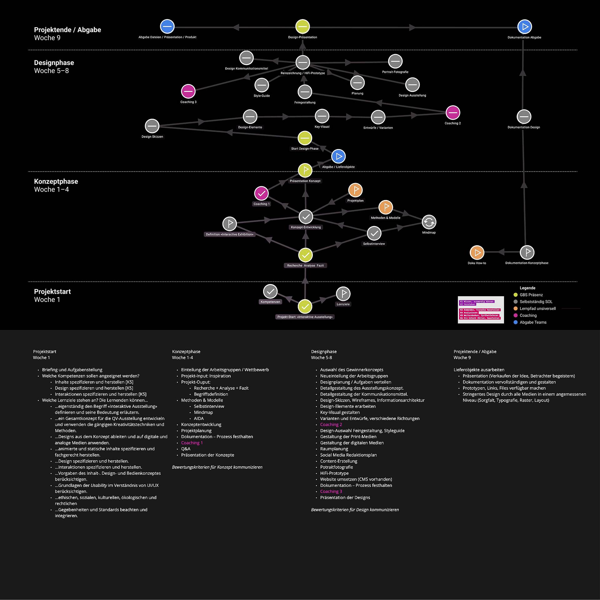 Was auf den allerersten Blick aussieht wie ein buntes Planetensystem, ist eine neue, innovative Art des Lernens. Ein sogenannter Lernpfad. Vom Projektstart geht es über Recherche zur Konzept-Entwicklung, über mögliche Abzweigungen wie Selbstinterview, Coaching und Mindmap schliesslich zur Präsentation, in die Design-Phase bis der letzte Punkt auf dem Pfad, die Abgabe, erreicht ist. Dabei führen unterschiedliche Wege zum Ziel. Mit diesem Plan arbeiten die Lernenden in Lehrberufen der Schule für Gestaltung im BLE-Projekt künftig. Die Bildungsverordnung wird in Module gepackt und pädagogisch aufbereitet abgebildet.