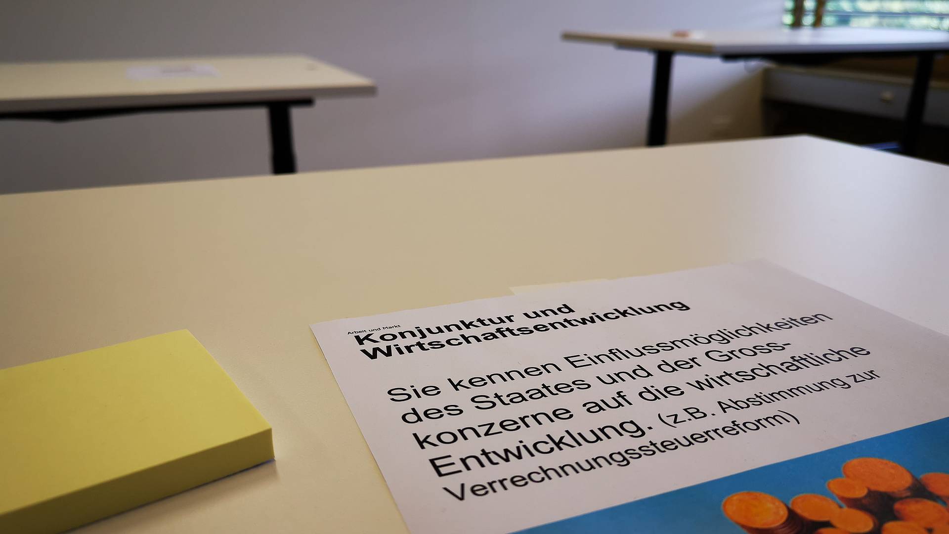 Dario Bühlmann ist neu mehr Coach als Lehrperson. Im Allgemeinbildenden Unterricht motiviert er die Lernenden, Verantwortung zu übernehmen und sich selbstständig mit verschiedensten Wirtschaftsthemenfeldern auseinanderzusetzen. An den Marktständen (Stehtische) liegen die verschiedenen Vertiefungsmöglichkeiten wie «Konjunktur und Wirtschaftsentwicklung» bereit.