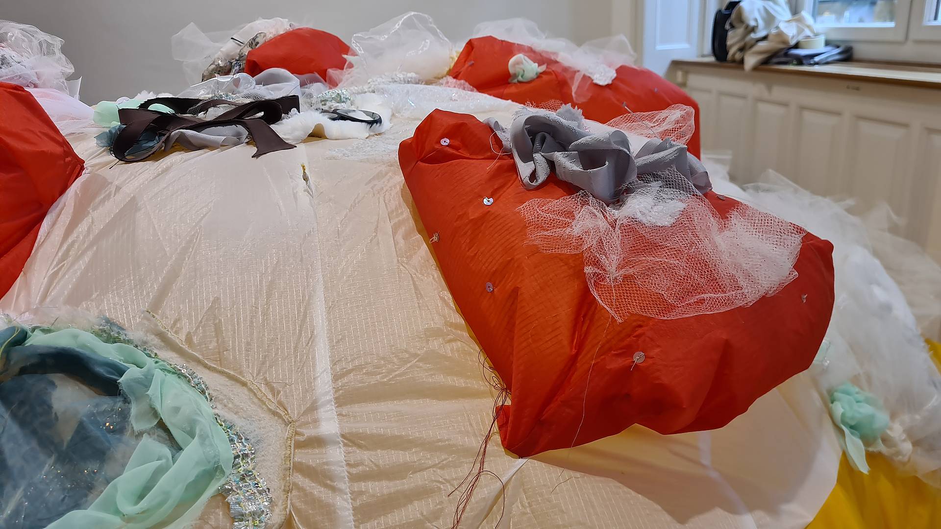 Die Studierenden liessen sich inspirieren, in dem sie den Verfall von Lebensmitteln zuerst im Schulzimmer dokumentierten. Am meisten her gab der Vergärungsprozess einer Aubergine, eines Erdbeertörtchen, einer Cherrytomate und einer Peperoni. Neben den Luftobjekten des Propädeutikum Vollzeit ist auch ein Film von der Teilzeit-Klasse im Textilmuseum zu sehen. Sie haben eigens für die Ausstellung Filme zum Thema Essen und Textil erstellt.