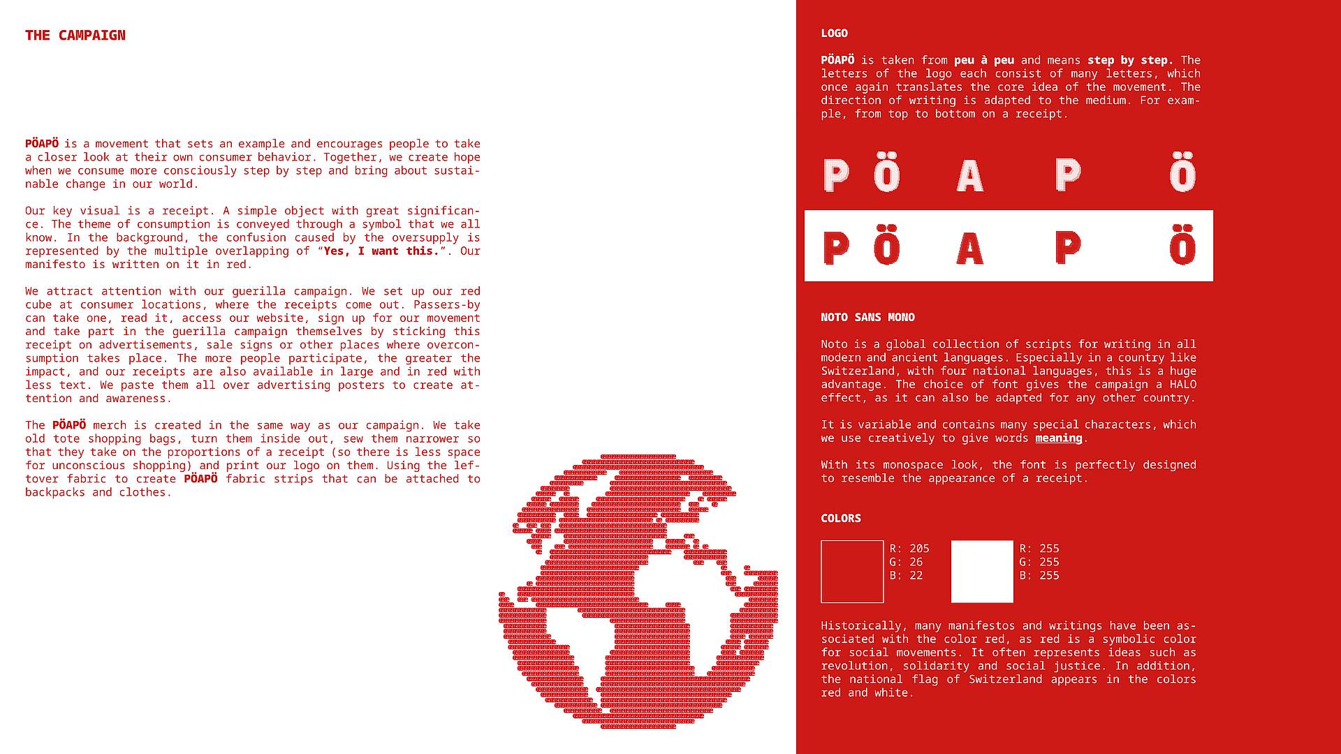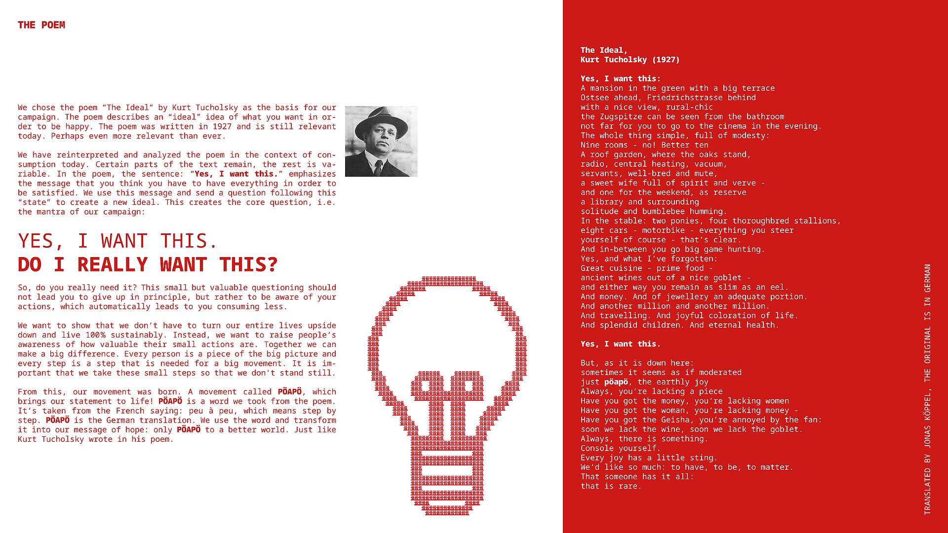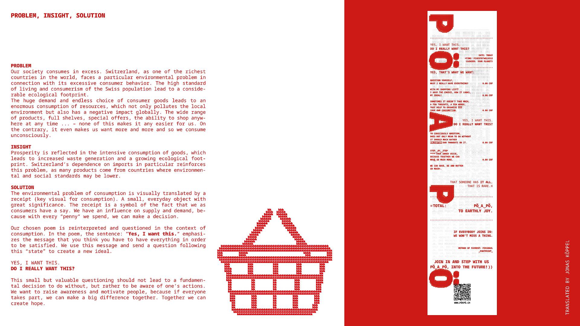 Die Lösung: Das Umweltproblem wird visuell durch einen Kassenbon dargestellt, der für Konsum steht. Er ist ein Symbol dafür, dass die Konsumenten/-innen selber einen Einfluss auf das Angebot und die Nachfrage haben. Zusammen mit dem neu interpretierten Gedicht «Das Ideal» von Kurt Tucholsky aus dem Jahr 1927 entsteht eine stimmige Kampagne.