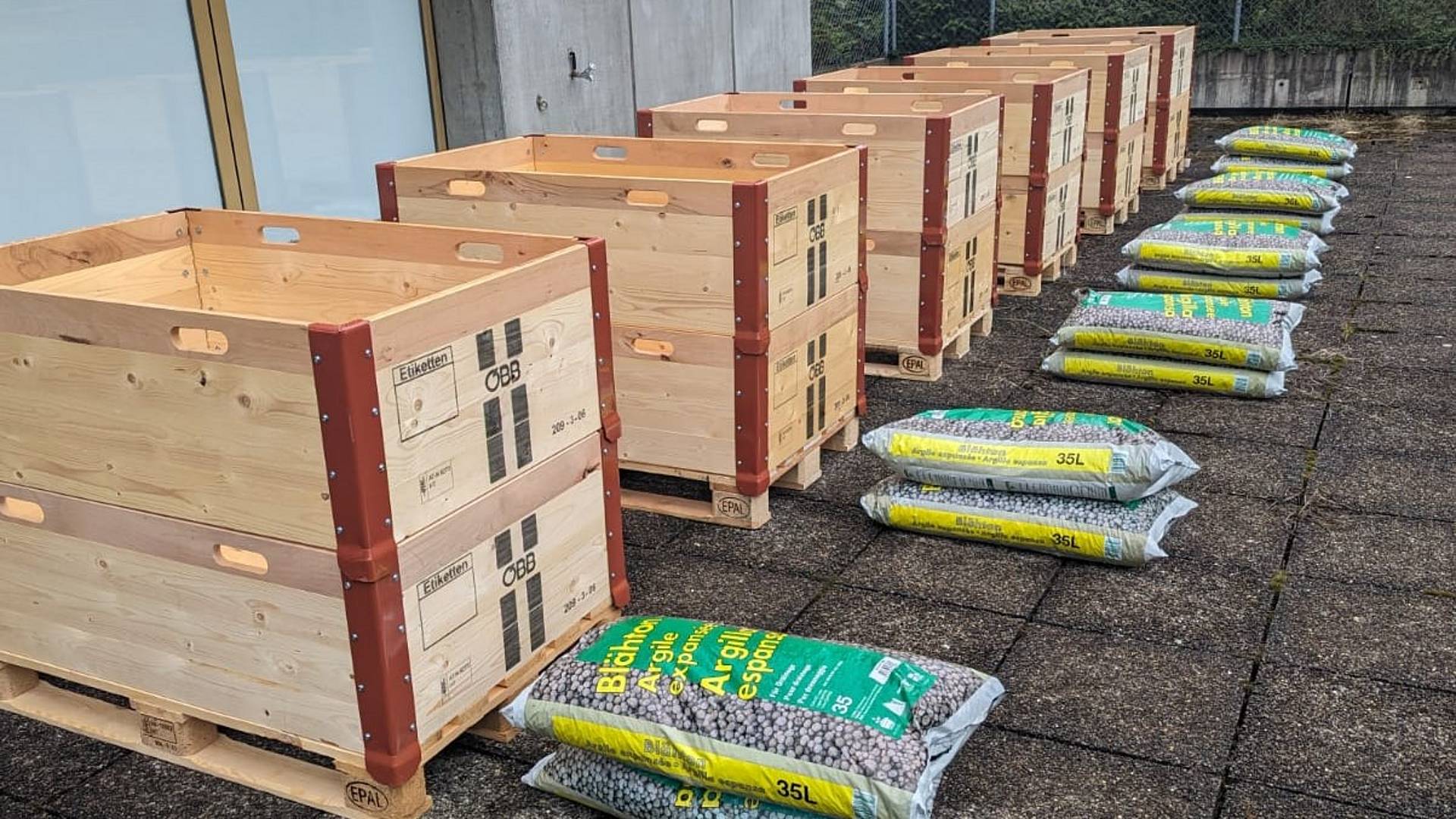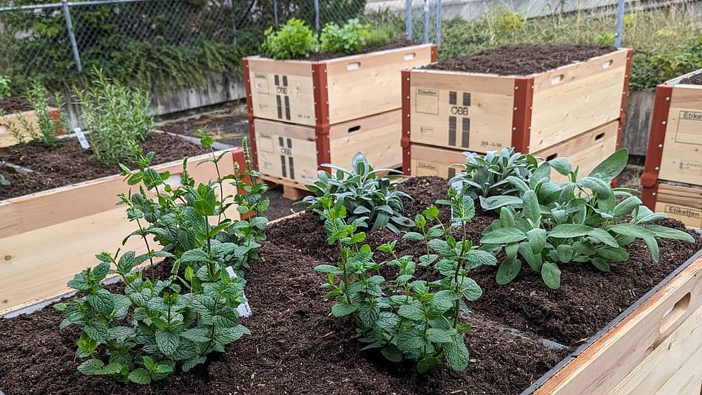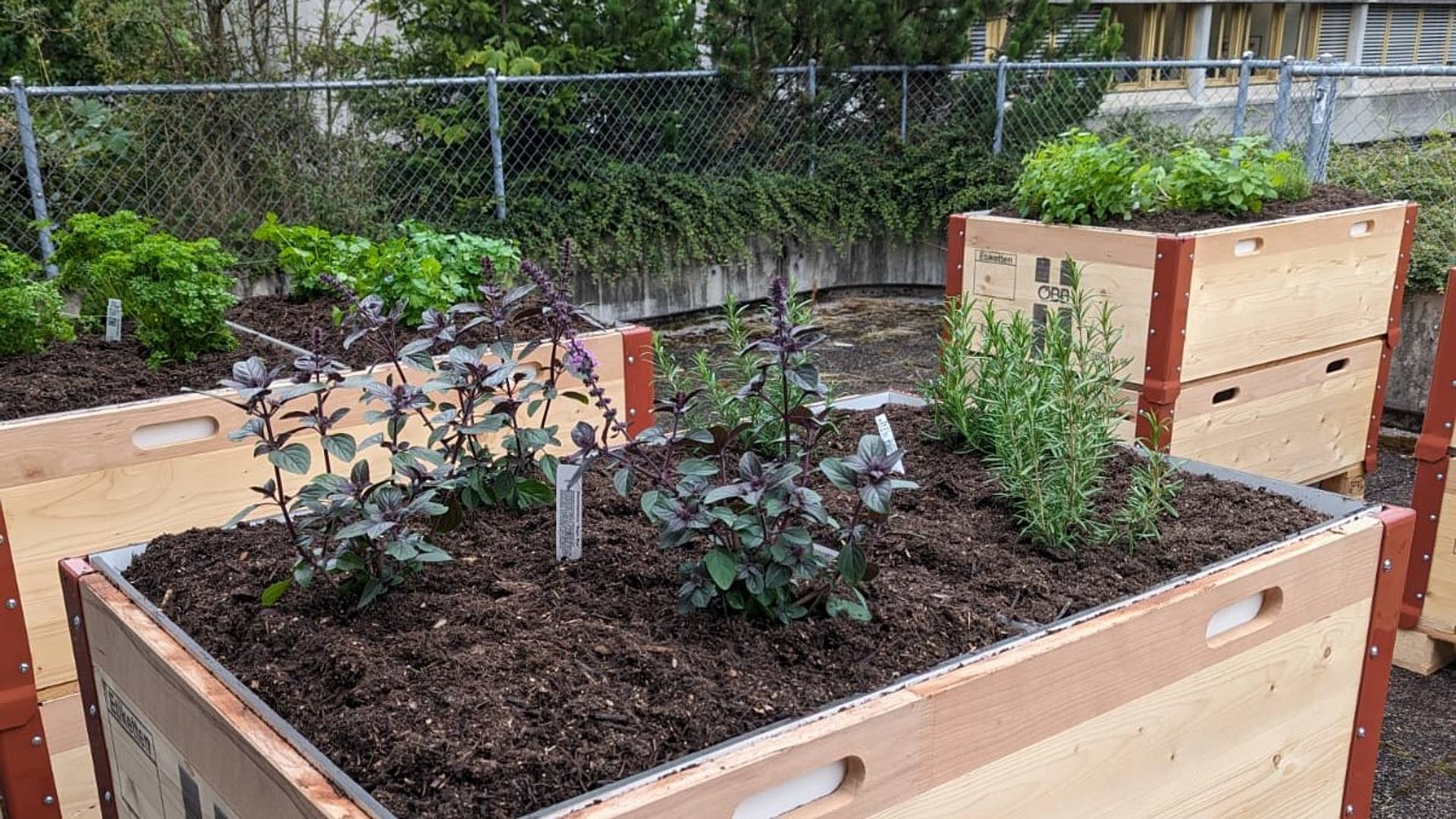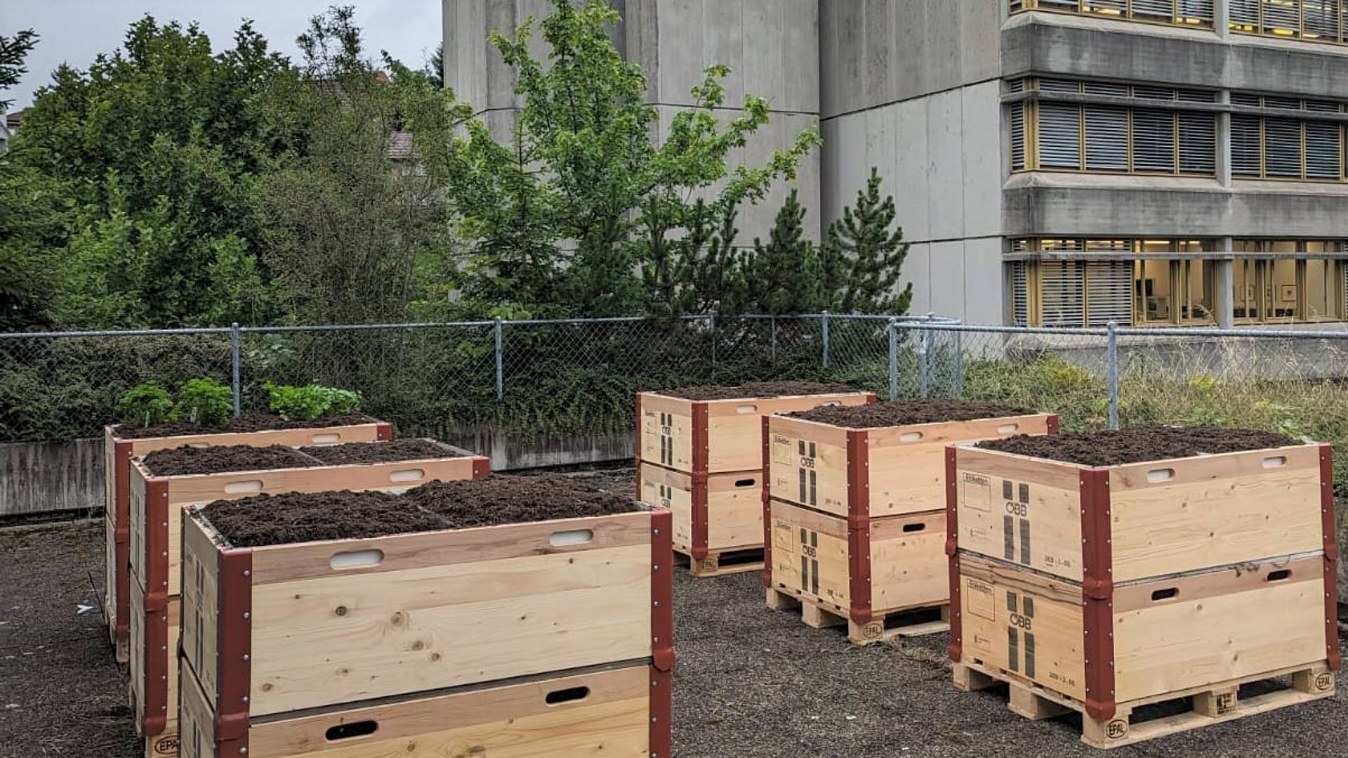 Auf der Terrasse der Schule für Gestaltung St.Gallen an der Demutstrasse positioniert Sandro Fiorillo sechs Palettenrahmen-Hochbeete. Anschliessend wird der Lernende des GBS-Betriebsunterhaltsteam Kräuter pflanzen. Für seine Menüs will das Mampf-Team Petersilie, Salbei, Thymian, Basilikum, Rosmarin und Zitronenmelisse aus der Eigenproduktion verwenden. Auch Blumen für Catering-Aufträge werden eingesetzt, damit die Dekoration der Apero-Häppchen überzeugt.