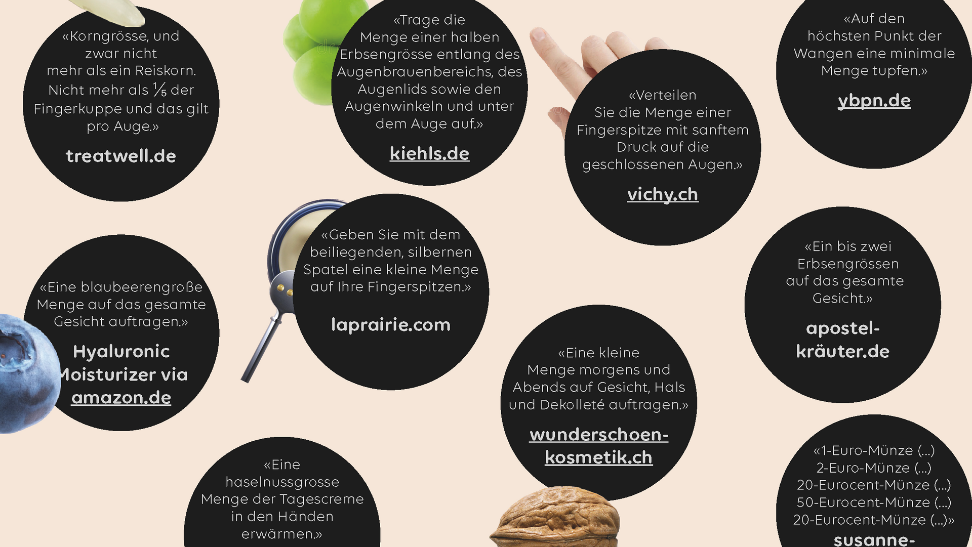Eine Konkurrenzanalyse hat Frischknecht darauf gebracht, dass bei Pflegeprodukten auf die korrekte Menge zu achten ist. Bei anderen Kosmetikherstellern/-innen heisst es auf der Packungsbeilage «Verteilen Sie die Menge einer Fingerspitze» oder «Eine kleine Menge morgens und abends auf Gesicht, Hals und Dekolleté auftragen».