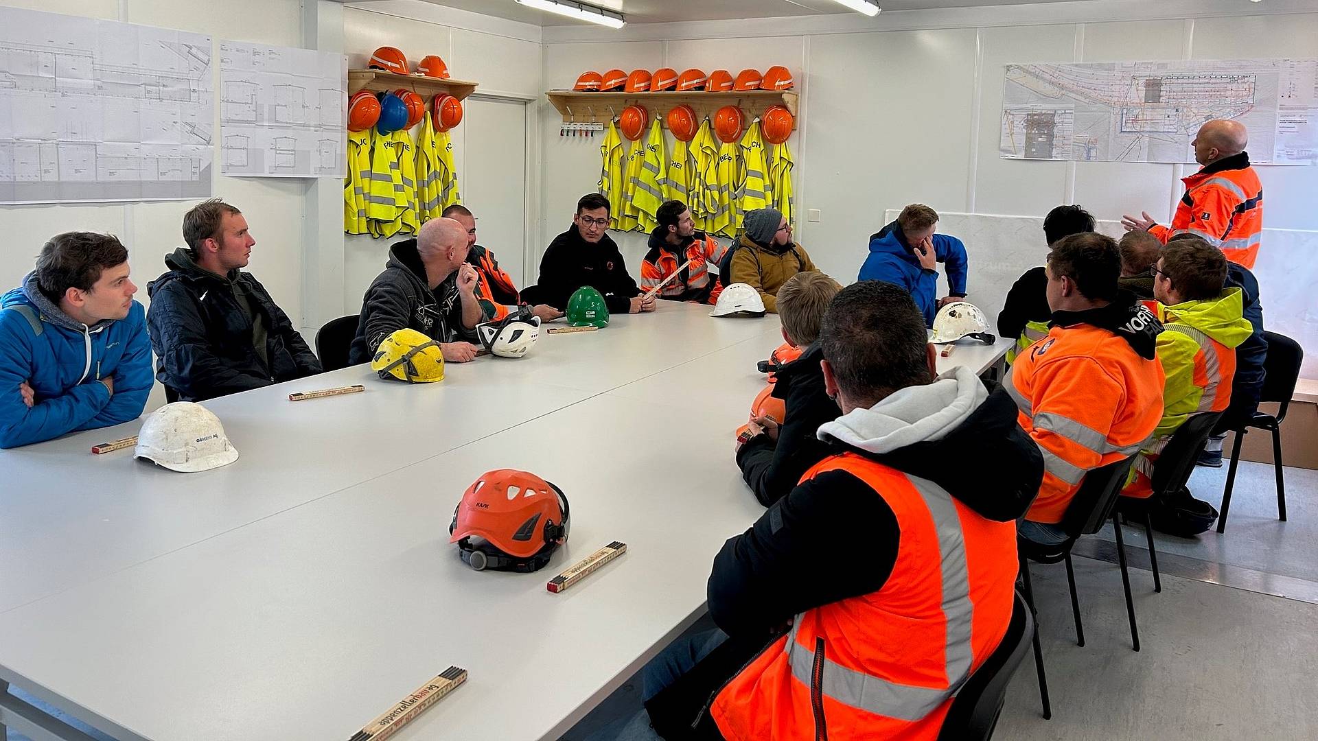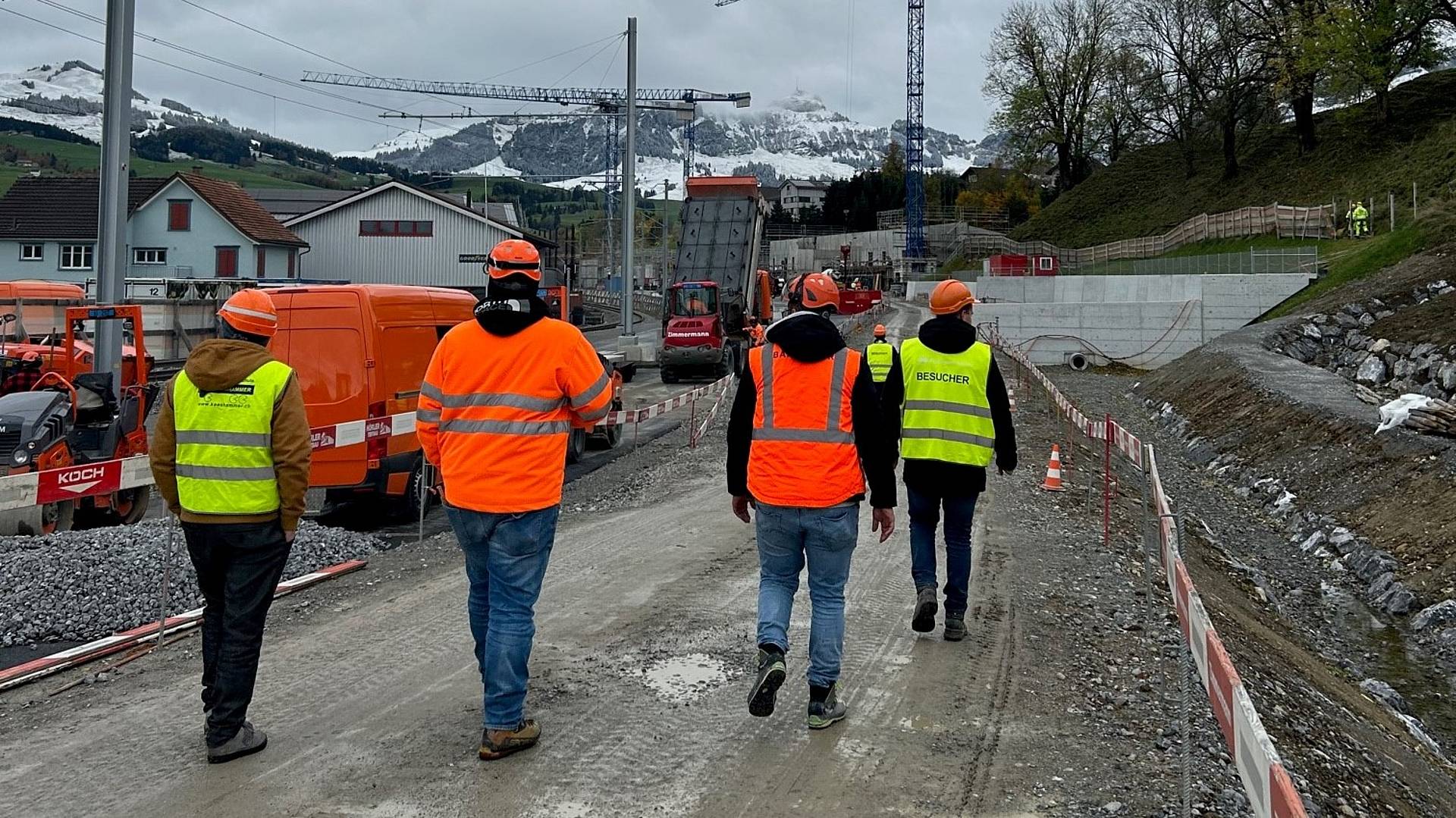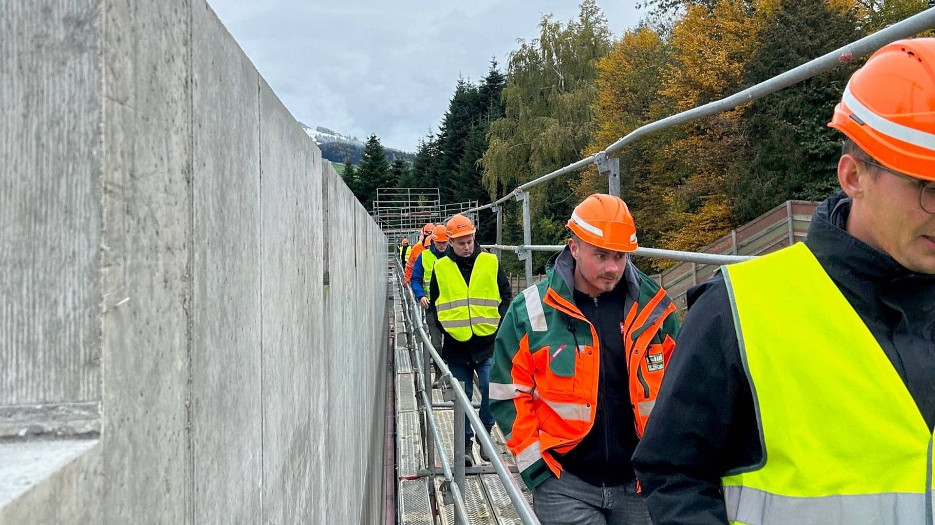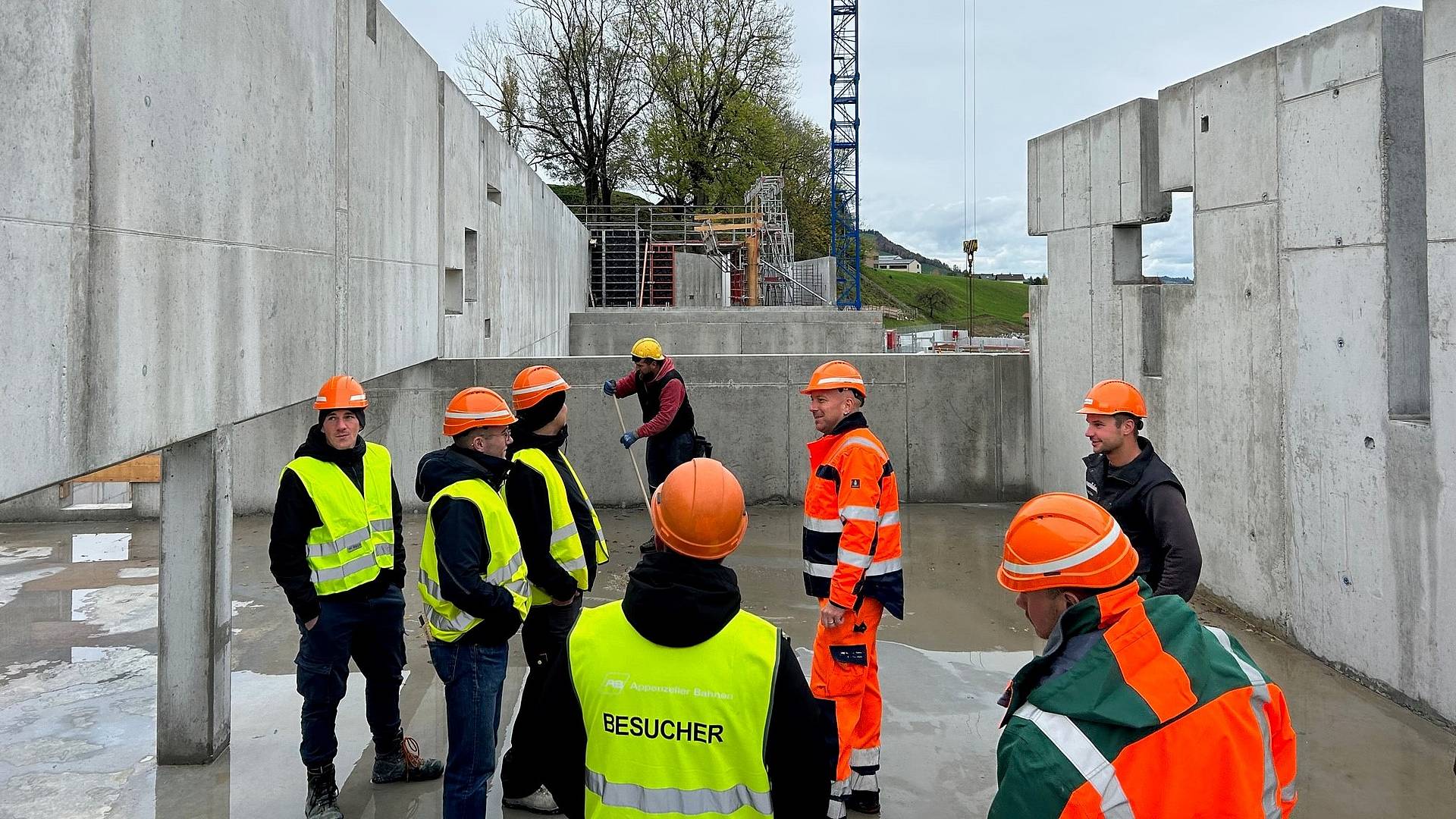 Die Baupoliere/-innen besichtigten mit Lehrperson Marcel Rechsteiner derweil die Baustelle für das ARGE Servicezentrum der Appenzeller Bahnen. Die Studierenden sahen, dass der Massivbau des Infrastrukturgebäudes weit fortgeschritten ist und die letzten Wände betoniert sind.