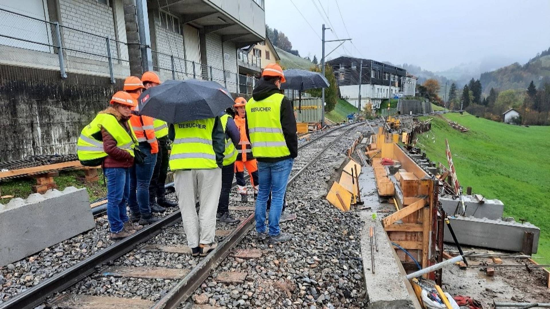 Phasenweise wird rund um die Uhr gearbeitet: Auf der Linie Gossau - Appenzell – Wasserauen werden diverse Kunstbauten, Trassees und Perrons saniert, umgebaut und/oder neu gebaut. Mit Samuel Steingruber hat ein Student der Baukaderschule St.Gallen an der Planung dieses Bauprojekts der Appenzeller Bahnen mitgewirkt. Seine Klasse durfte die Baustelle besichtigen.