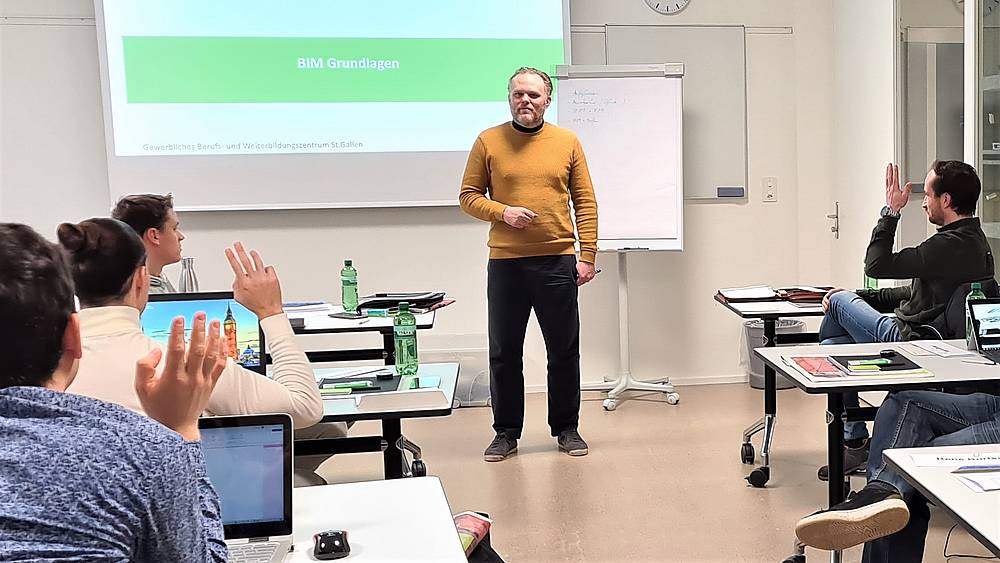 Das ist stark! Über die Hälfte der Teilnehmenden des Kurses BIM-Manager verfügt über eine BIM-fähige Software im Unternehmen und nutzt sie. Jetzt vertiefen sie an der Baukaderschule St.Gallen ihr Wissen und setzen ein Projekt mit BIM auf. Das sei notwendig, denn die Baubranche könne effizienter agieren, sagt Referent Simon Dilhas.