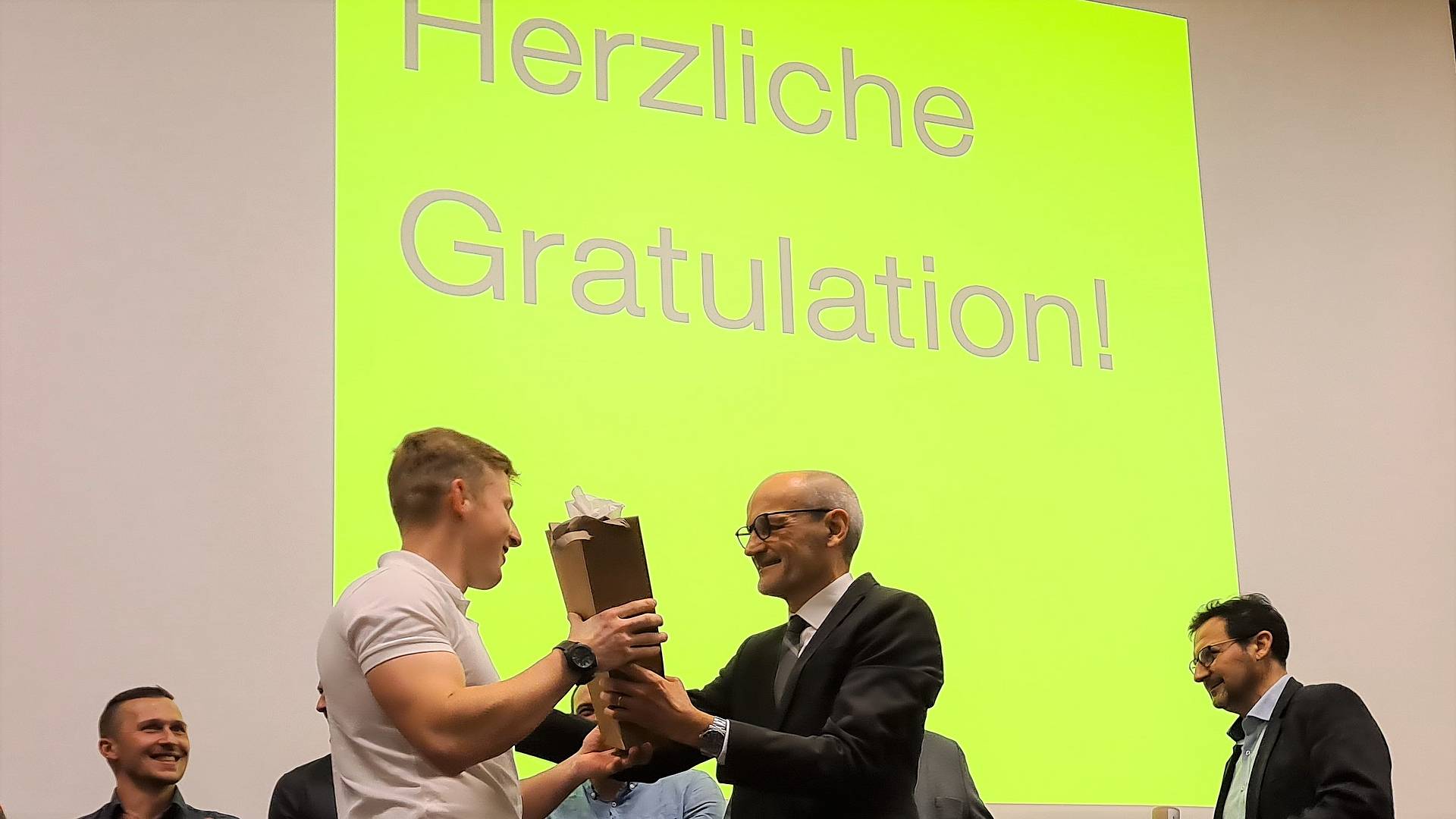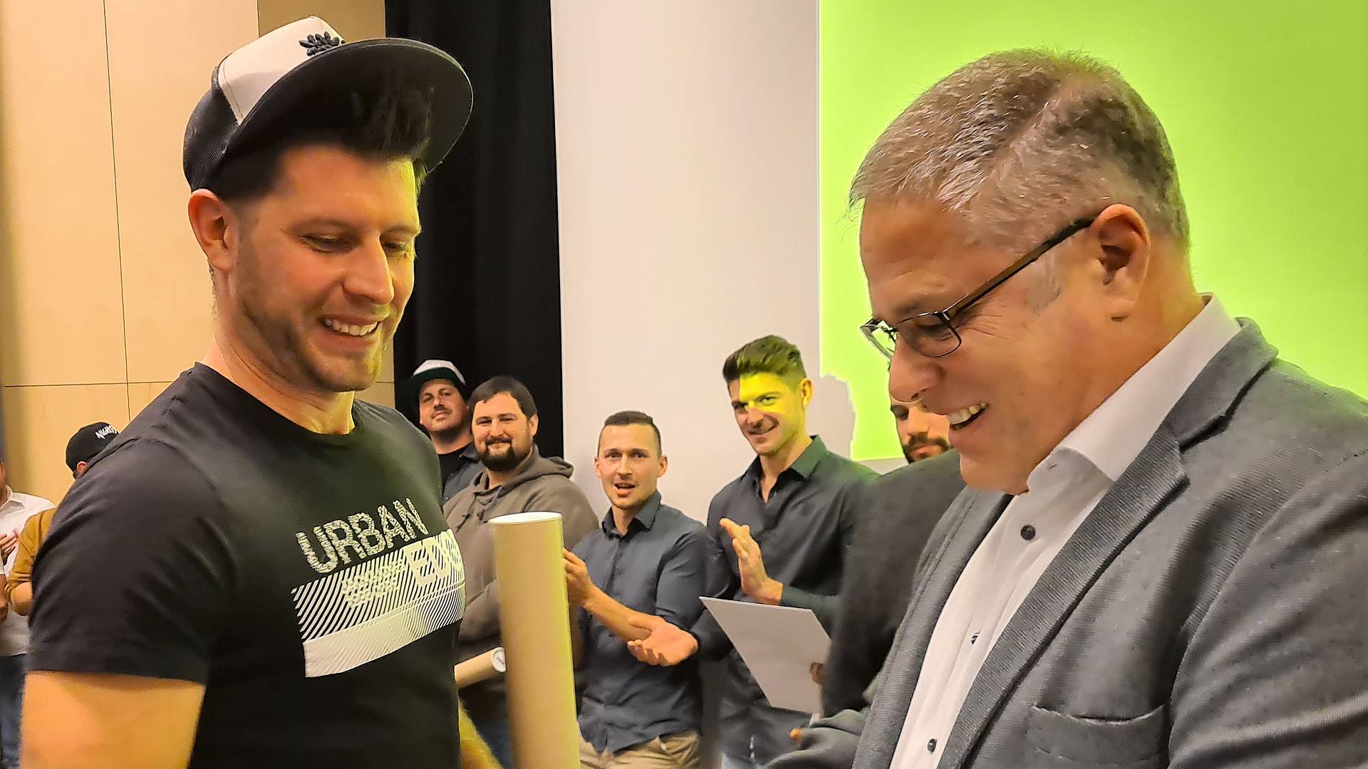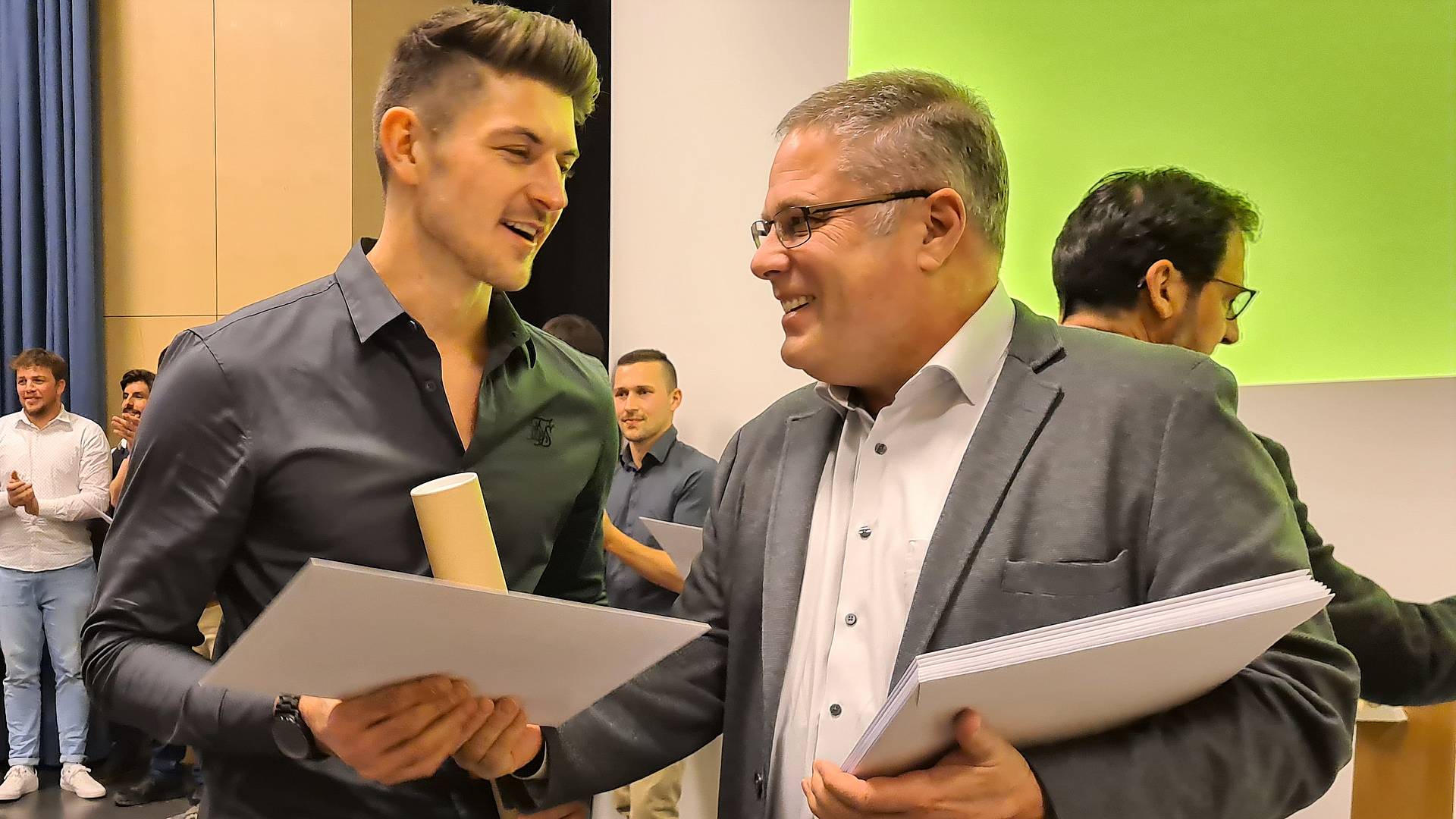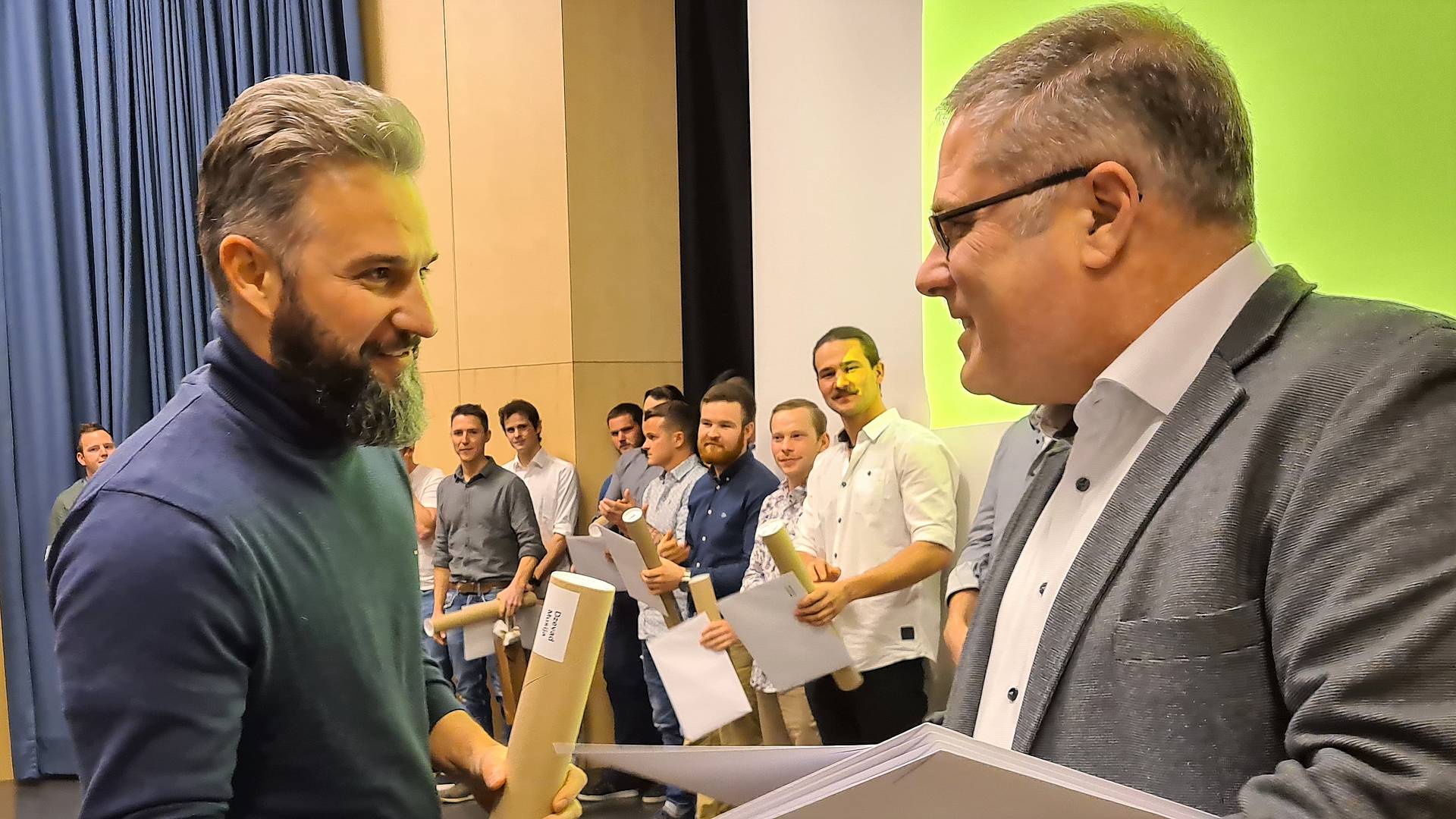 Welch Fachwissen sich die Diplomanden angeeignet haben, beweist auch der starke Notenschnitt von 4,8. Bester des gesamten Baupolier-Jahrgangs 2021 – 2023 war Christoph Stadelmann aus der Parallelklasse von Marco Germann. Mit einer 5,3 rechnete er im Vorfeld überhaupt nicht und beinahe wäre auch er noch ans Rednerpult gestanden. «Ich habe mir überlegt, meinen Klassenkollegen zu danken. Meine Note ist ein Gemeinschaftswerk, denn ich habe vom Austausch enorm profitiert», so Christoph Stadelmann am anschliessenden Apéro riche, der vom Mampf-Team zubereitet wurde. Als gelernter Zimmermann sei er froh um die Diskussionen mit den gelernten Maurern gewesen. «Jeder macht es auf seine Art. Darüber zu sprechen, hat mir geholfen.»