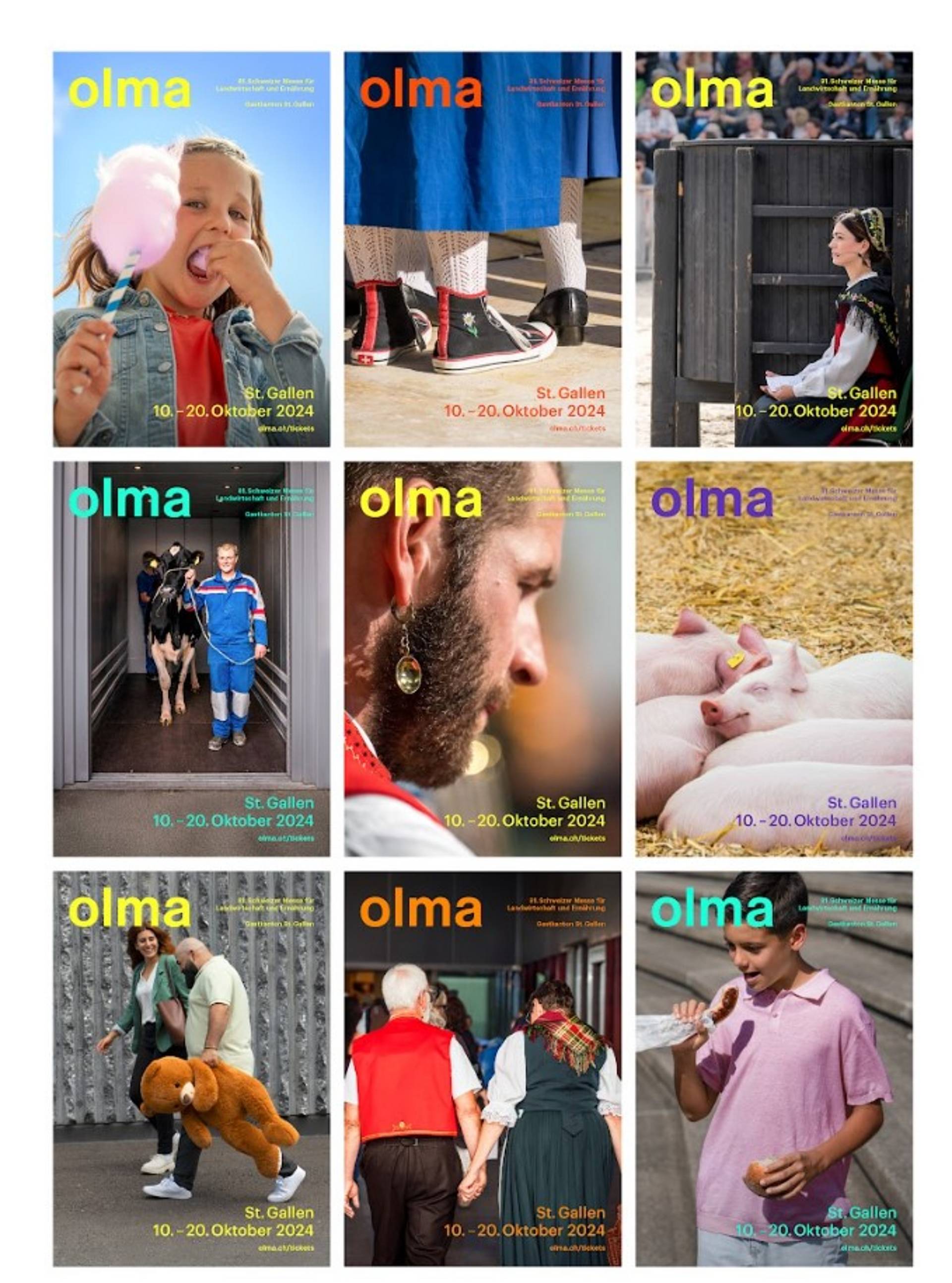 Es sind diese Fülle an Erinnerungen, welche die St.Galler Agentur «Die Gestalter» für die diesjährige Herbstmesse aufgreift. Anstatt nur ein einzelnes Bild zu verwenden, setzt sich die diesjährige Kampagne aus neun Bildern zusammen. So geniesst beispielsweise ein Mädchen eine Zuckerwatte und ein älteres Paar in Tracht schlendert Hand in Hand über das Messegelände. Alle Plakate ergeben zusammen ein harmonisches Gesamtbild und stehen für Olma-Momente. Beat Lüscher, Lehrer am GBS St.Gallen und Mitorganisator der Interactive Media Design Days, erklärt: «Uns war es wichtig, die Olma aus der Perspektive der Besuchenden zu zeigen – so wie sie ist.» Die unterschiedlichen Sujets würden auf einen Spaziergang über das Olma-Gelände einladen.