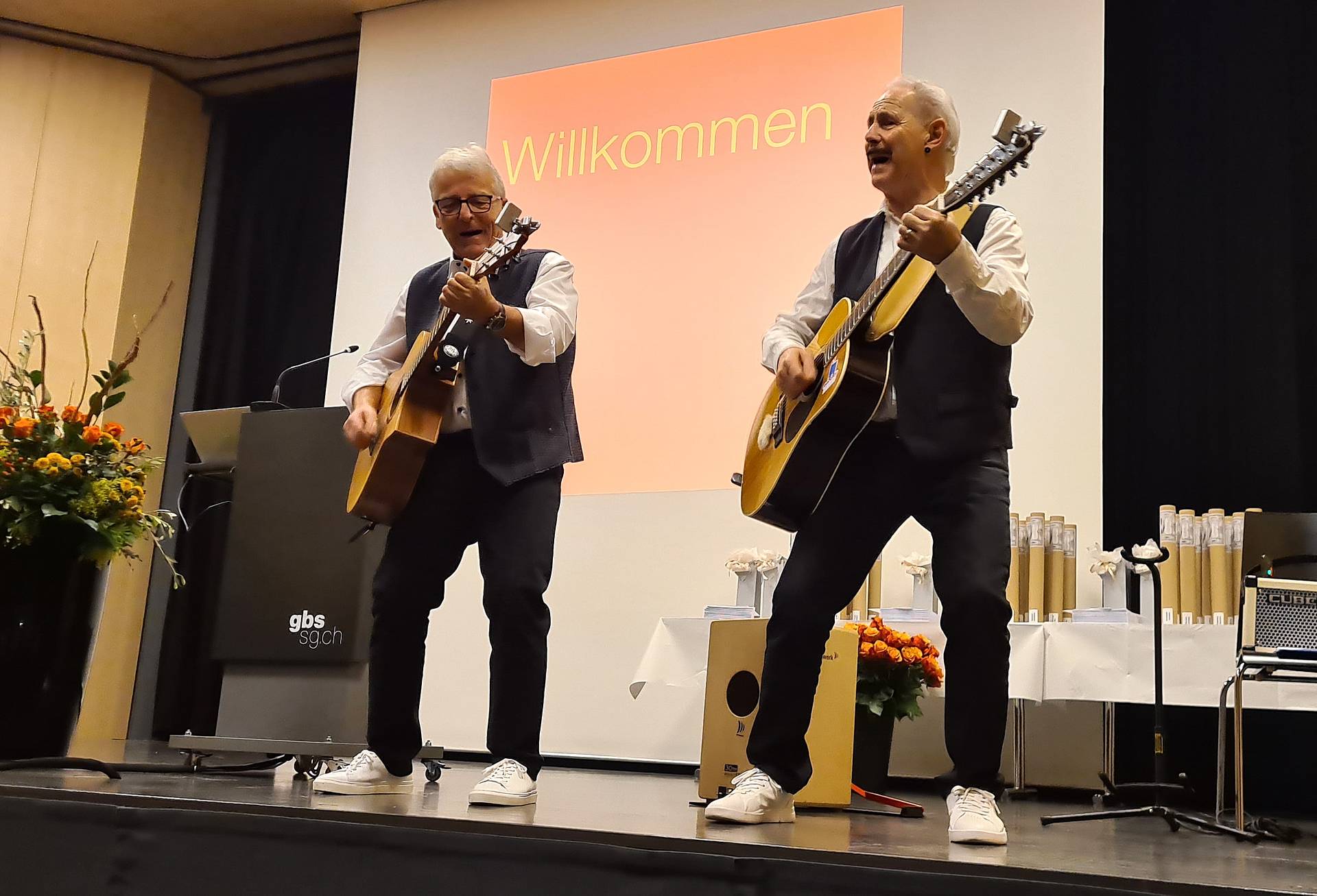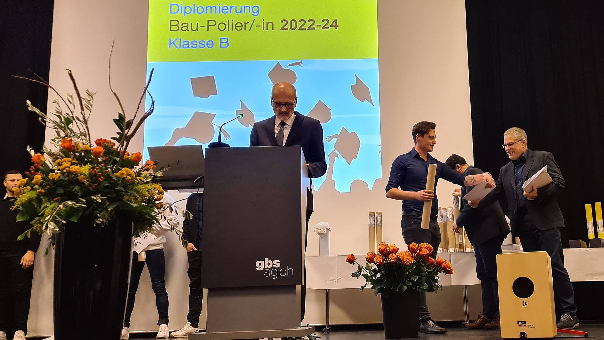 «Mir wönd de Plausch ha!» – besser hätte die Songauswahl zum Start der Diplomfeier der Baupoliere/-innen nicht sein können. Das Duo Swiss Singers empfing die Absolventen in der Aula des GBS St.Gallen ihrer Stimmung entsprechend. Bruno Mitterer, Leiter der Baukaderschule St.Gallen, nahm diese Atmosphäre sogleich auf: «Diplomfeiern sind für uns als Schule immer besondere Anlässe. Wie beim Aufrichtefest auf der Baustelle wird auch hier das gute Gelingen eines gemeinsam geschaffenen Werkes gefeiert.»