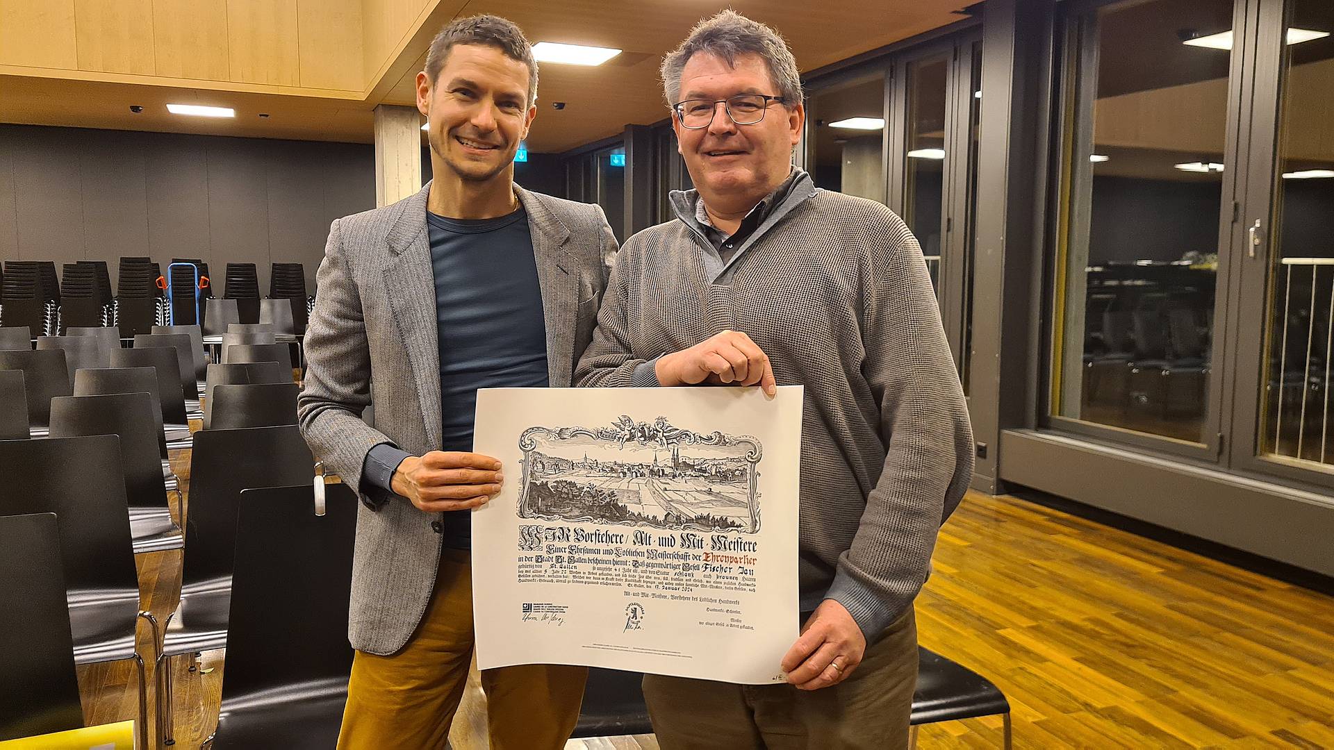 Zum Ehrenparlier ernannt wurden Jan Fischer und Roger Wälchli. In den vergangenen fünf Jahren leitete Jan Fischer am GBS St.Gallen den Bereich Weiterbildung mit der Baukaderschule St.Gallen und der Schule für Gestaltung St.Gallen. Bruno Mitterer würdigt: «Er hat wesentlich dazu beigetragen, dass unsere Schule dort steht, wo sie heute ist und was sie ist – nämlich einzigartig.»
