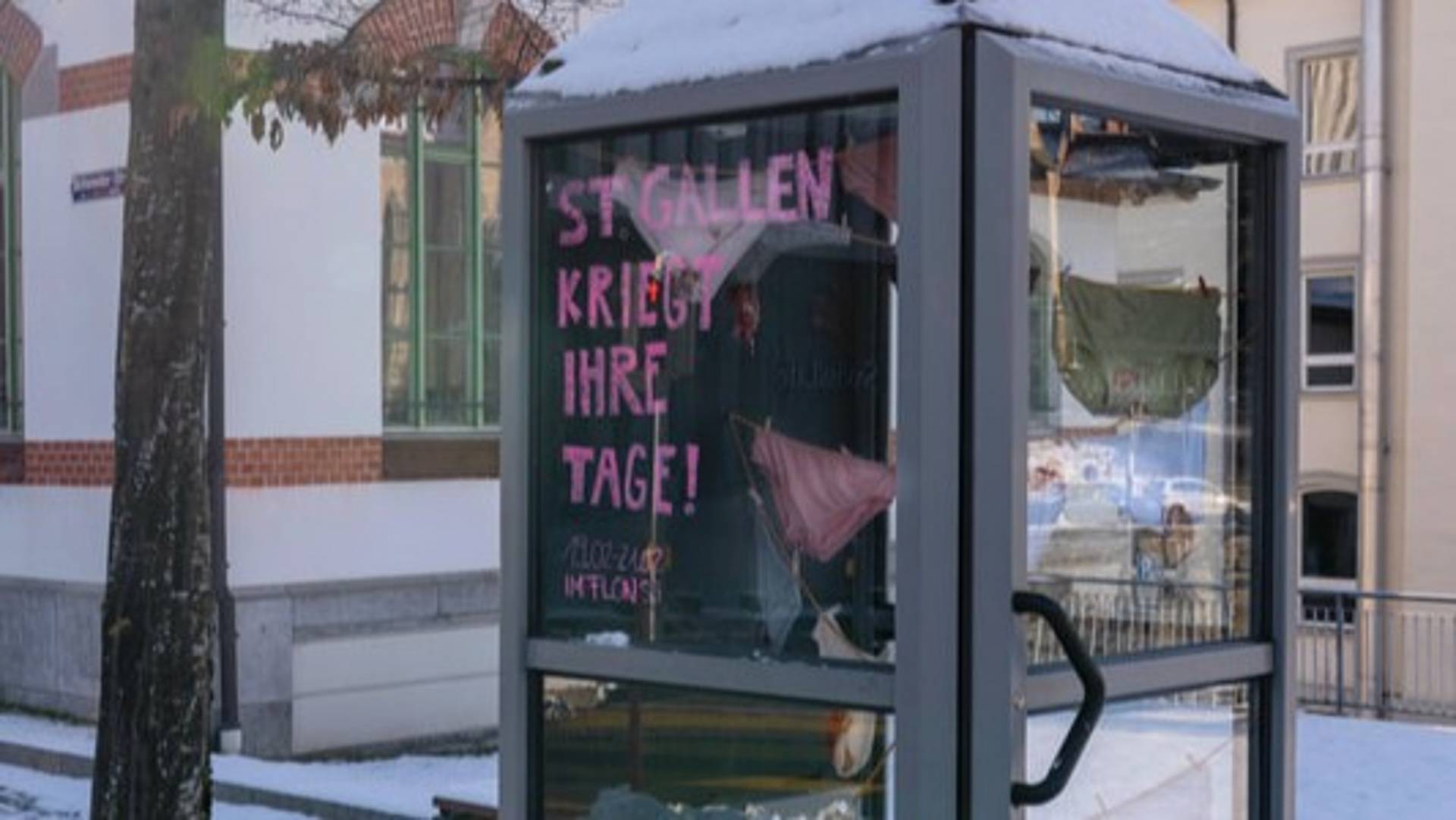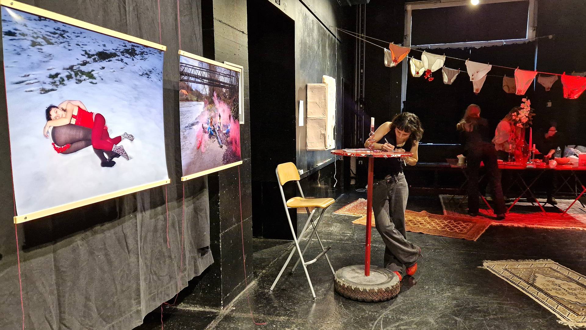 Bereits im Januar machte das Trio auf seine interdisziplinäre Projektarbeit und die damit verbundene Ausstellung im «Flon» aufmerksam. In der Telefonkabine auf der St. Leonhardsbrücke wiesen Unterhosen, die mit Periodenflecken bestickt sind, auf die viertägige Ausstellung Ende Februar hin.