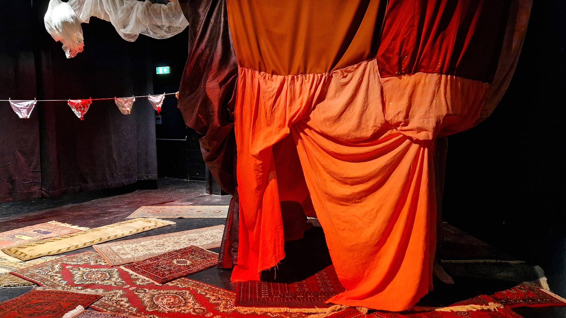 Ein rotes Zelt. Eine kuschelige Höhle. Im Zentrum des Jugendzentrums Flon konnten Besucher:innen der Ausstellung eine überdimensionale, begehbare Gebärmutter bestaunen. Endlich bekomme das Organ so viel Platz, wie ihm zusteht, finden Hanna Schuster, Sara Vetsch und Tonja Merz. Die Soundinstallation im Innern der Gebärmutter entstand durch eigne Aufnahmen während der Menstruation.