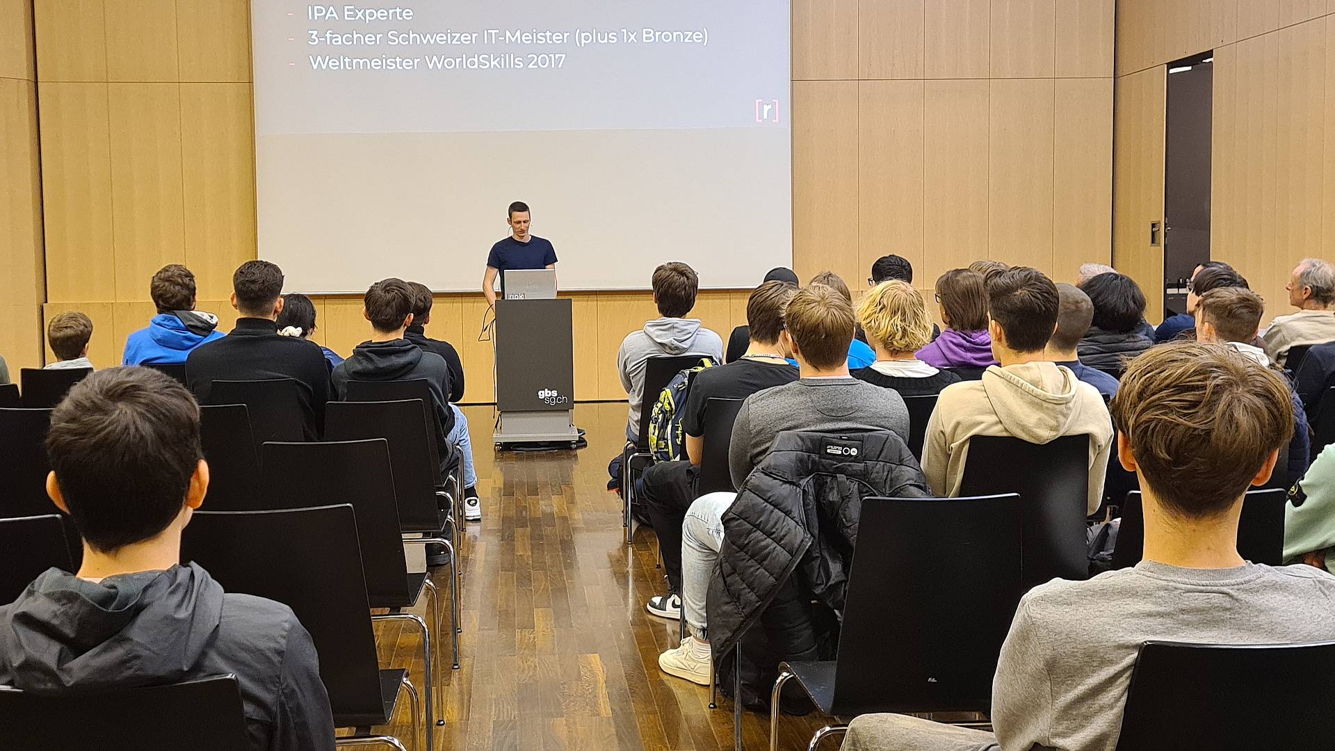 In Abu Dhabi krönte sich Manuel Allenspach zum Weltmeister in der Disziplin «IT Software for Business». An den WorldSkills 2017 führte kein Weg an ihm vorbei. «Es war ein einmaliges Erlebnis. Es brauchte eine gewisse Zeit, bis ich begriff, was ich erreicht hatte», sagt Manuel Allenspach. In seiner Rückblende erwähnt er vor den Informatikklassen in der Aula des GBS St.Gallen auch die professionelle Vorbereitung durch den Verband SwissSkills. Ihm gefielen die Anlässe mit dem Nationalteam, das junge Erwachsene aus verschiedensten Berufen vereinte. Ihn brachte ebenso das angebotene Mentaltraining weiter. «Die WorldSkills 2026 in China können ein Thema für euch sein», sagt Manuel Allenspach.