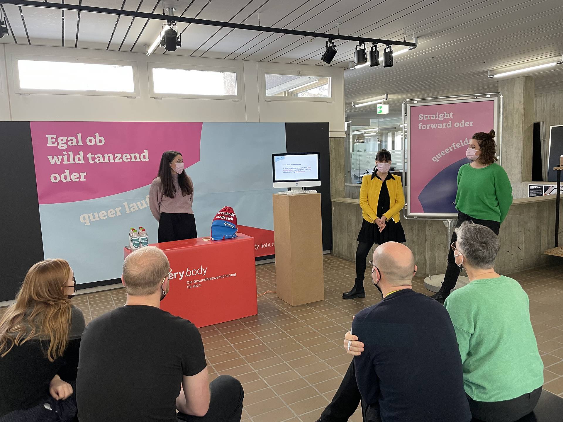In der Schweiz herrscht eine Krankenversicherungspflicht. Für eine solche Versicherung muss man sich aber einem Geschlecht zuordnen. Nonbinäre Personen werden also ausgeschlossen. Die Lösung für dieses Problem präsentiert Gruppe 5 mit Daniela Schönenberger, Sabrina Ferri und Romina Bärtsch: die erste Gesundheitsversicherung für alle Geschlechter. Für everybody. Die Querstellung im Logo ist das Wiedererkennungsmerkmal, das sich durch die ganze Kampagne zieht, sowohl in Wortspielen als auch im Gestalterischen.