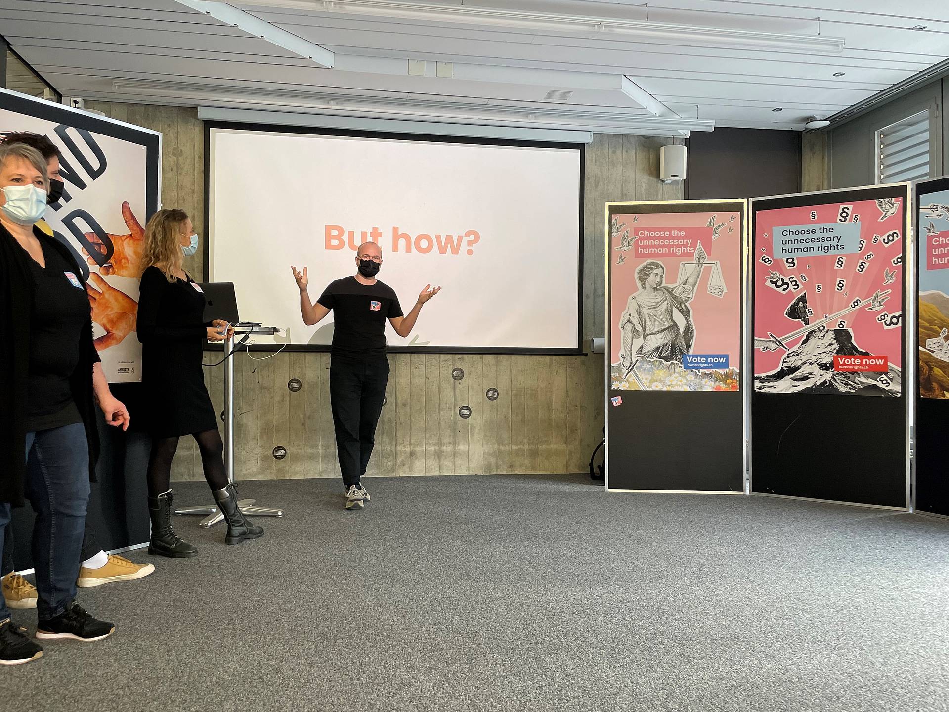 Mehr als 60 Prozent der weltweiten Bevölkerung haben keine Ahnung, was alles zu den Menschenrechten gehört. Das trifft auch auf die Schweiz zu. «Wir haben kaum Bezug dazu.» Das wollen Nicole Giesch, Karin Blöchlinger, Adrian Iten und Simon Costabiei mit ihrer Arbeit ändern. Sie haben sich für ein unkonventionalles Voting etschieden. Und küren mit einer Abstimmung und einem Award das «unnötigste Menschenrecht». Die Strategie dahinter: feststellen, konfrontieren und sensibilieren.