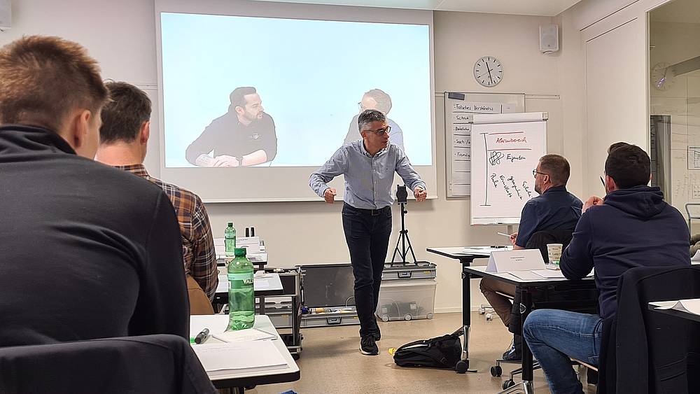 Das Gespräch fand zwischen den Kursteilnehmenden Andreas (Bauführer) und Daniel (Bauleiter) statt. Es wurde aufgezeichnet und vor dem ganzen Kurs abgespielt. Solche Praxisbeispiele sind eine der grossen Stärken des neuen Kurses an der Baukaderschule. «Wir trainieren und analysieren viele Situationen, damit die Teilnehmenden selber ihre Wirkung sehen und daran arbeiten können», sagt Kursleiter Roger Zosso von der T&C Trainingsconsult AG.