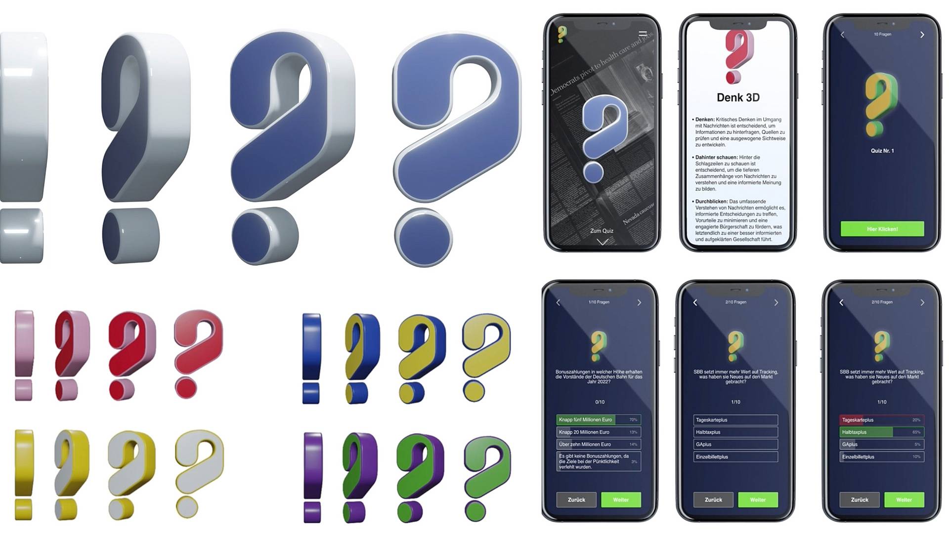 Die Awareness-Kampagnen wurde im Modul Activation Design konzipiert und entworfen. Die Gruppe «Wahrzeichen» mit Giulia Becce, Misa Tanner und Vincent Gehl fordert dazu auf, News zu hinterfragen und kritisch zu denken. «Wir spielen mit dem Ausrufe- und Fragezeichen», erklärt Vincent und fügt an: «Die lauten Fake News werden durch ein animiertes Ausrufezeichen visualisiert, das sich bei näherer Betrachtung durch Rotation zu einem hinterfragenden Fragezeichen verwandelt.»