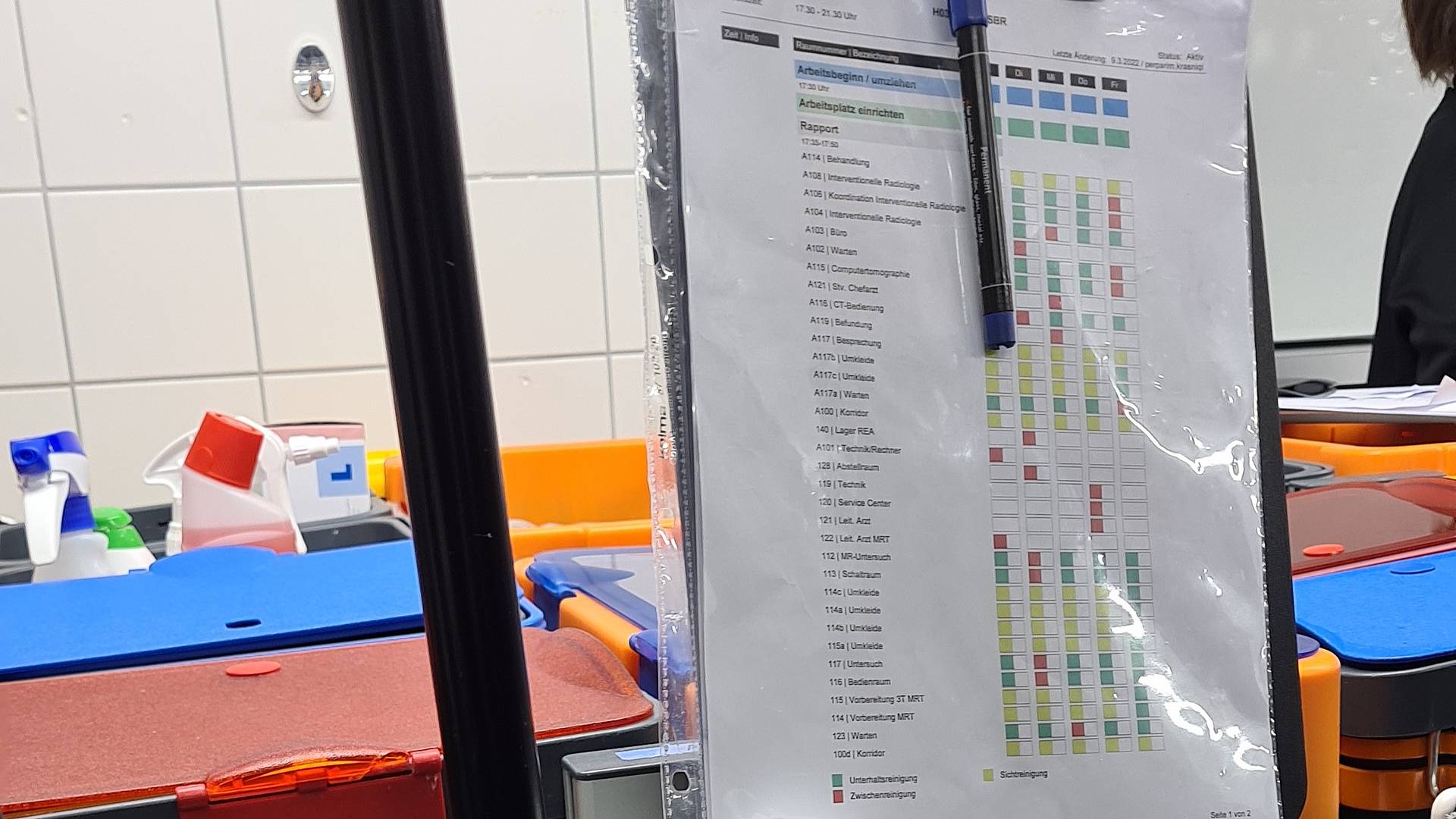 Auf digitalem und analogem Weg werden die Arbeitsanweisungen verteilt. Die Unterlagen halten mit Piktogrammen fest, was und wie in welcher Reihenfolge gereinigt wird. Künftig kommen rund 35'000 Quadratmetern an Reinigungsfläche dazu. Im Haus 07A wird im Erdgeschoss Platz für die zentrale Eingangshalle, die Patientenaufnahme sowie für interdisziplinäre Ambulatorien bietet. Im ersten Obergeschoss werden die Intensivstationen sowie Behandlungsräume für diverse Kliniken gebaut. Im zweiten Obergeschoss werden zehn Operationssäle in Betrieb genommen und im Hochhaus werden bis Ende Jahr sechs Bettenstationen zur Verfügung stehen.