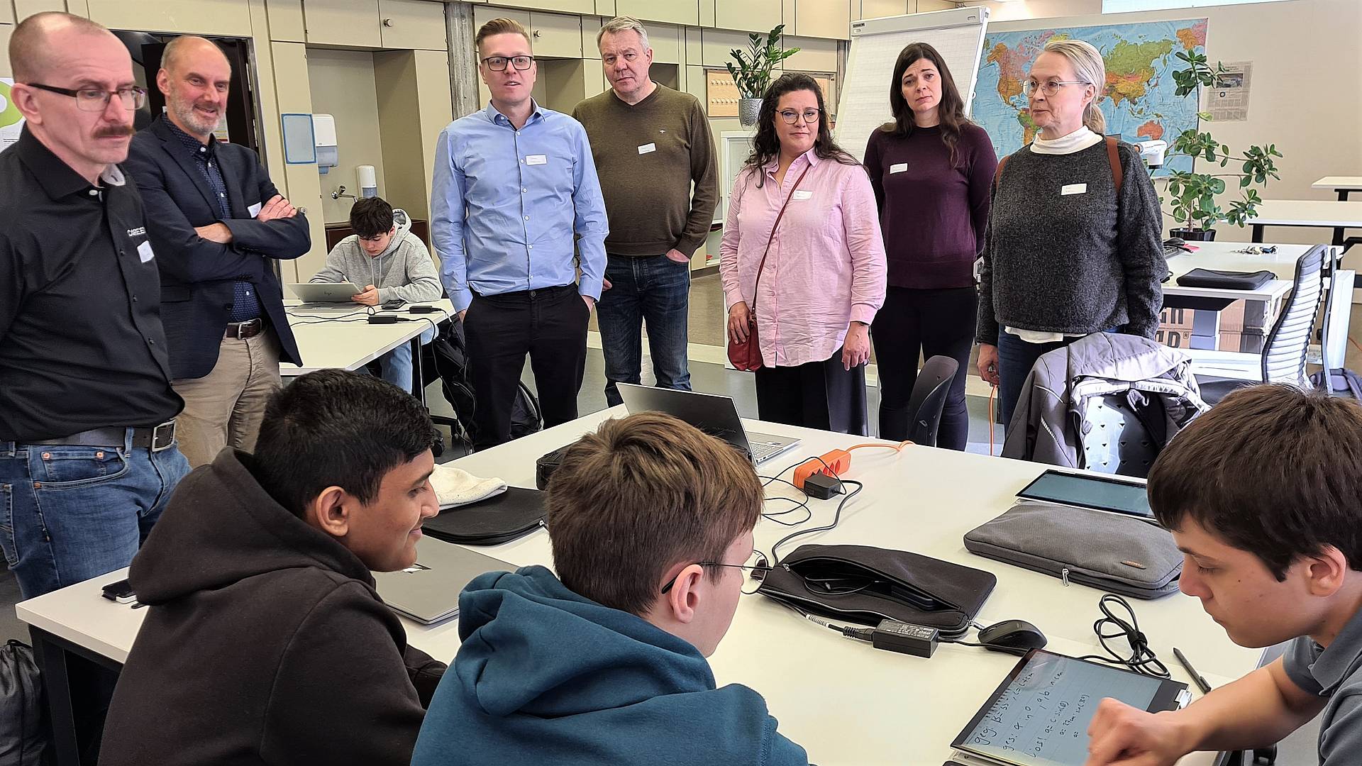 Gestaunt haben die finnischen Gäste auch darüber, wie viel Verantwortung die Lernenden im Lehrbetrieb und im Berufsschulunterricht bereits übernehmen dürfen. In der Lernlandschaft im vierten Stock des GBS-Schulhauses im Riethüsli wird der Fokus beispielsweise weg vom Frontalunterricht auf mehr selbstorganisiertes Arbeiten gerichtet. Während sich einige Automatiker*innen EFZ individuell in Lerngruppen auf die anstehende Mathematik-Prüfung vorbereiteten, sassen die anderen in der Arena und sogen den theoretischen Input der Lehrperson auf.