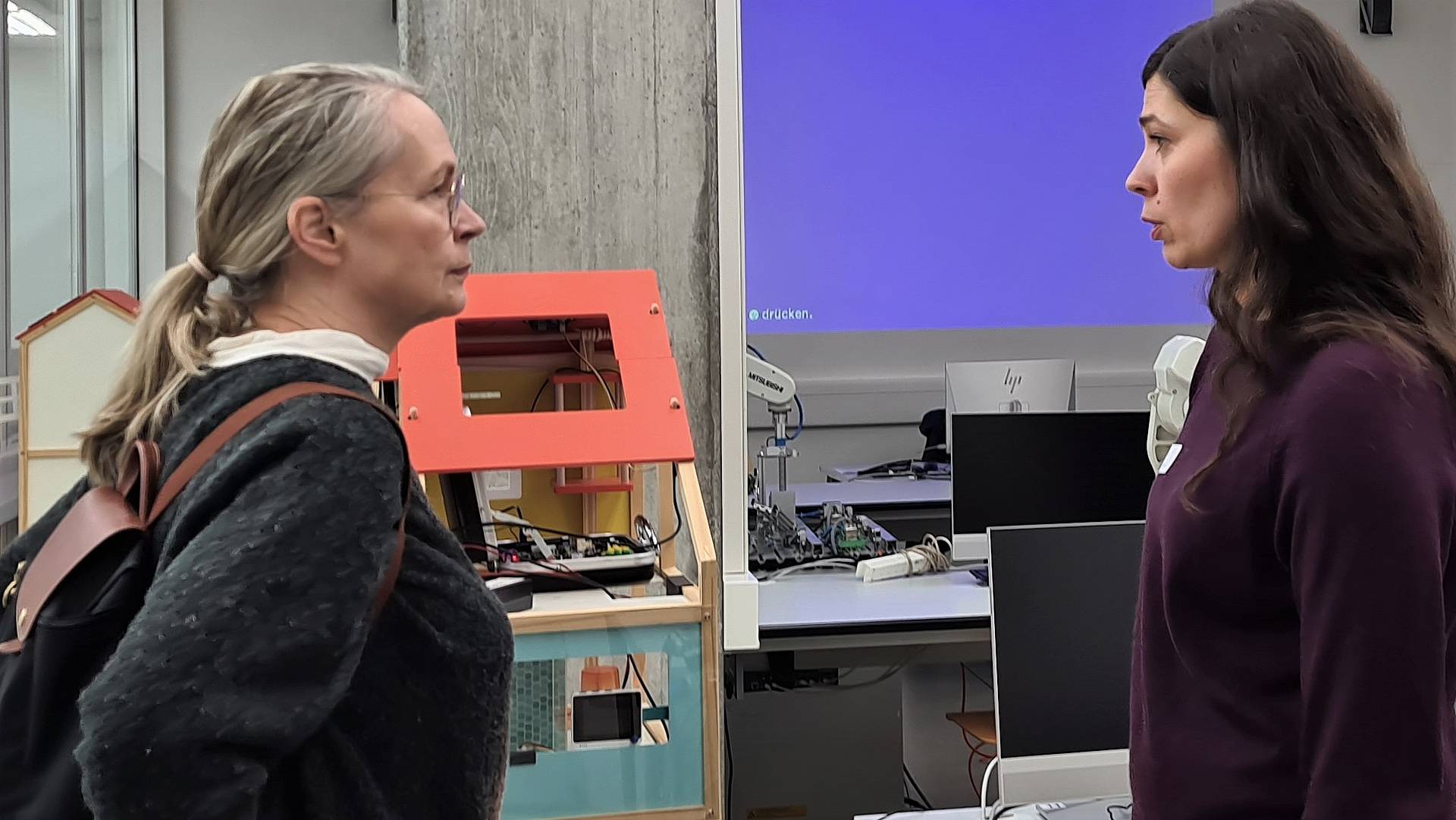 Wie die ideale Mischung aus Theorie und Praxis aussehen kann, demonstrierte Lehrer Fabian Reifler in der «Internet of Things»-Werkstatt. Hier können die Schüler*innen über ihren eigenen Laptop auf vernetzte Puppenhäuser (Smart Home) zugreifen und beispielsweise das Licht regulieren oder die Raumtemperatur reduzieren. Jürg Pfeiffer scherzte: «Diese Werkstatt ist das Herz der Abteilung Technische Berufe. Jetzt sorgen wir für eine finnische Sauna.»