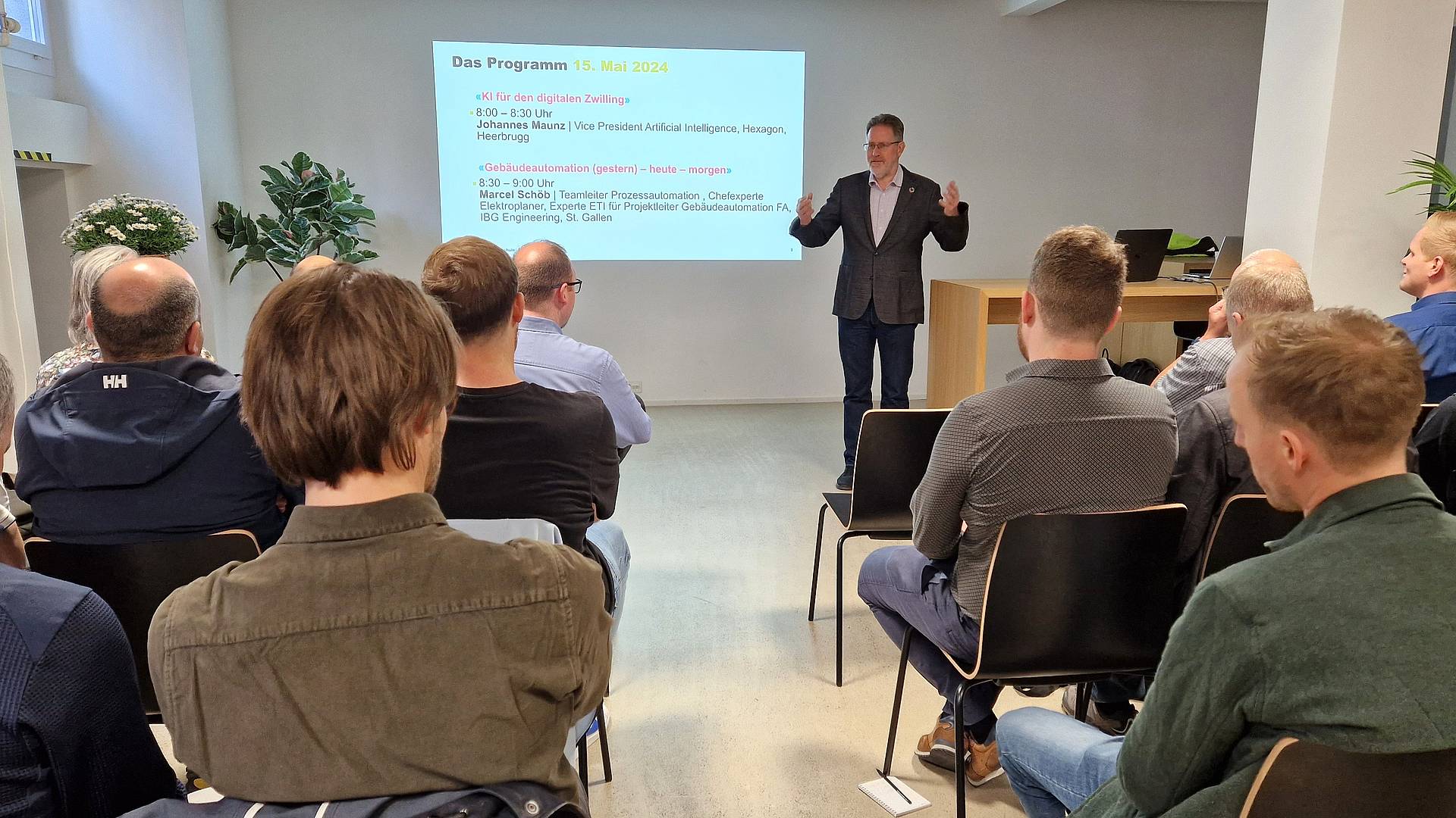Am Frühstücksgespräch der Baukaderschule St.Gallen erklärt Johannes Maunz, wie Hexagon mit Künstlicher Intelligenz (KI) digitale Zwillinge erstellt und diese weiterentwickelt. In der Gebäudeautomation rechnet Marcel Schöb, der zweite Referent, damit, dass Cloud-basierte Lösungen immer wichtiger werden.