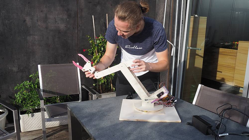 }Bestandteil des Projekts waren der Entwurf des Roboterarms, Konstruktion des Roboterarms unter Einsatz modernster Technologien, Aufbau der notwendigen Elektronik zur Steuerung der Servos von Arduino, Entwicklung einer Programmierumgebung für den Roboterarm sowie Programmierung der Robotersteuerung. «Basil und Jan haben dieses anspruchsvolle Ziel auch unter den erschwerten Umständen des Fernunterrichts erreicht», so ihr Fachlehrer und fügt hinzu: «Sie haben mit viel Eigeninitiative eine herausragende interdisziplinäre Leistung gezeigt.»