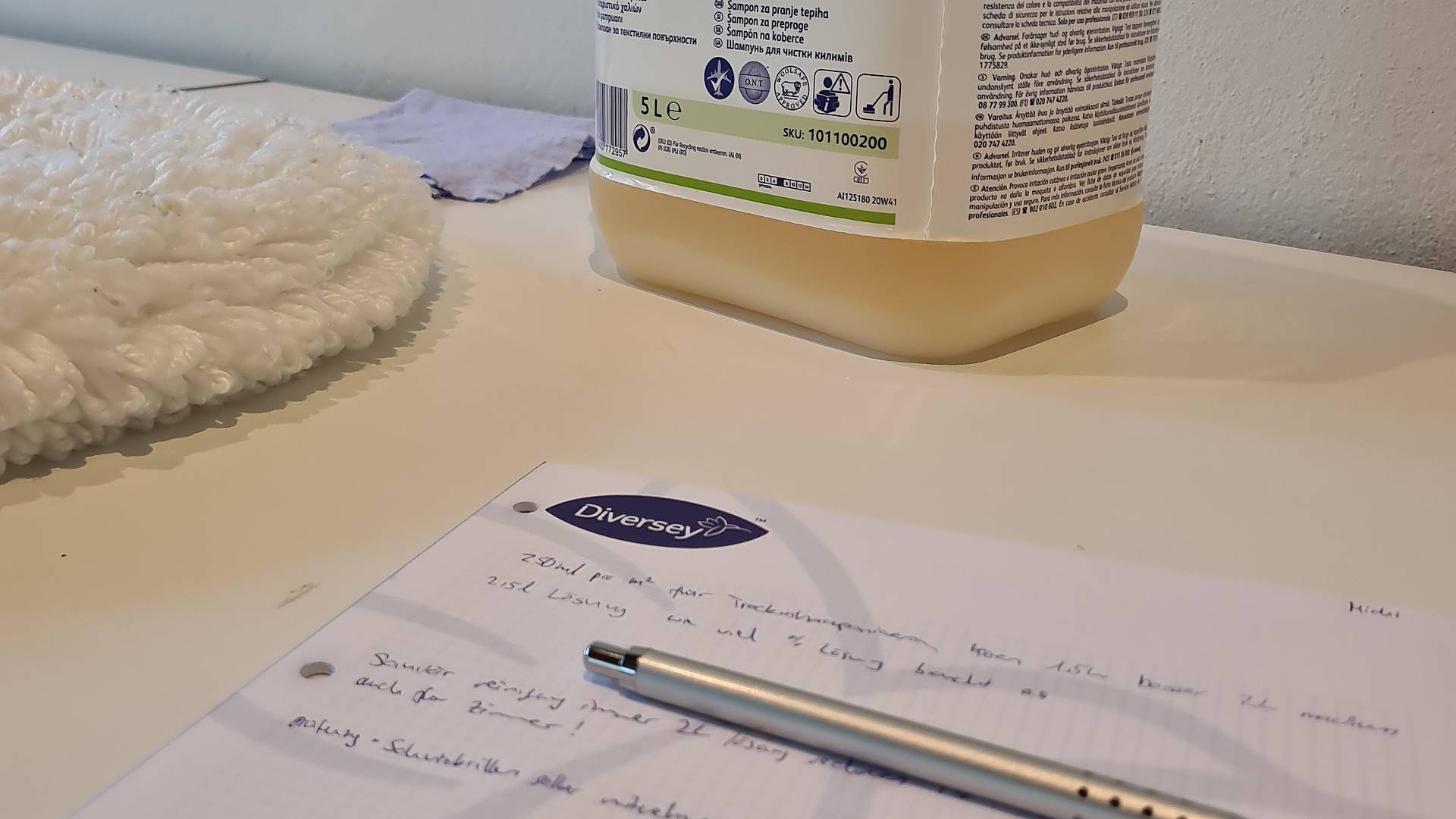 Wie viele Milliliter Reinigungslösung werden pro Quadratmeter Teppich gebraucht? Hauswarte/-innen müssen rechnen – und an der eidgenössischen Berufsprüfung sogar unter zusätzlichem Druck. «Es sind 250 Milliliter pro Quadratmeter. Nehmt an der Prüfung zur Sicherheit immer etwas mehr Wasser dazu, dass die Menge ausreicht», sagt Markus Hirzel, Leiter Training Center Diversey. Die Studierenden notieren fleissig mit, denn hier in Münchwilen TG beim Hersteller von Reinigungs- und Hygieneprodukten erhalten sie wertvolle Tipps.