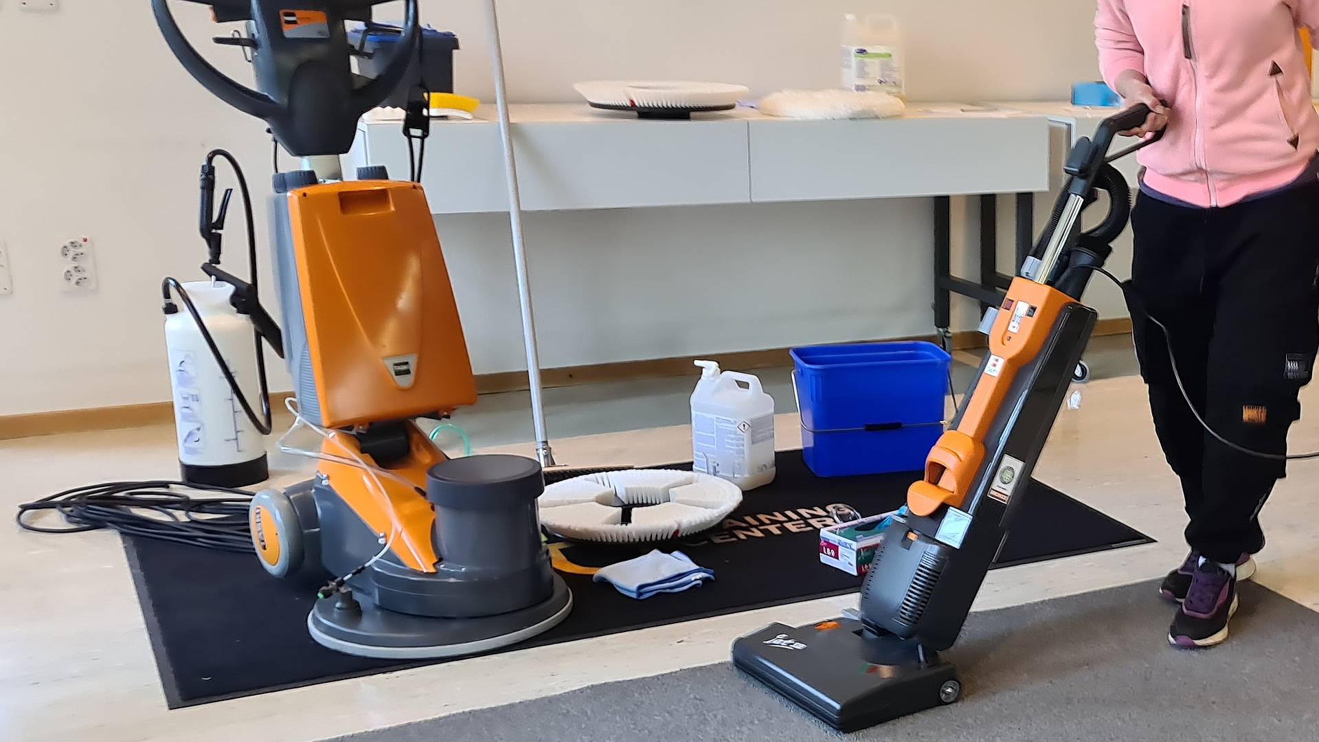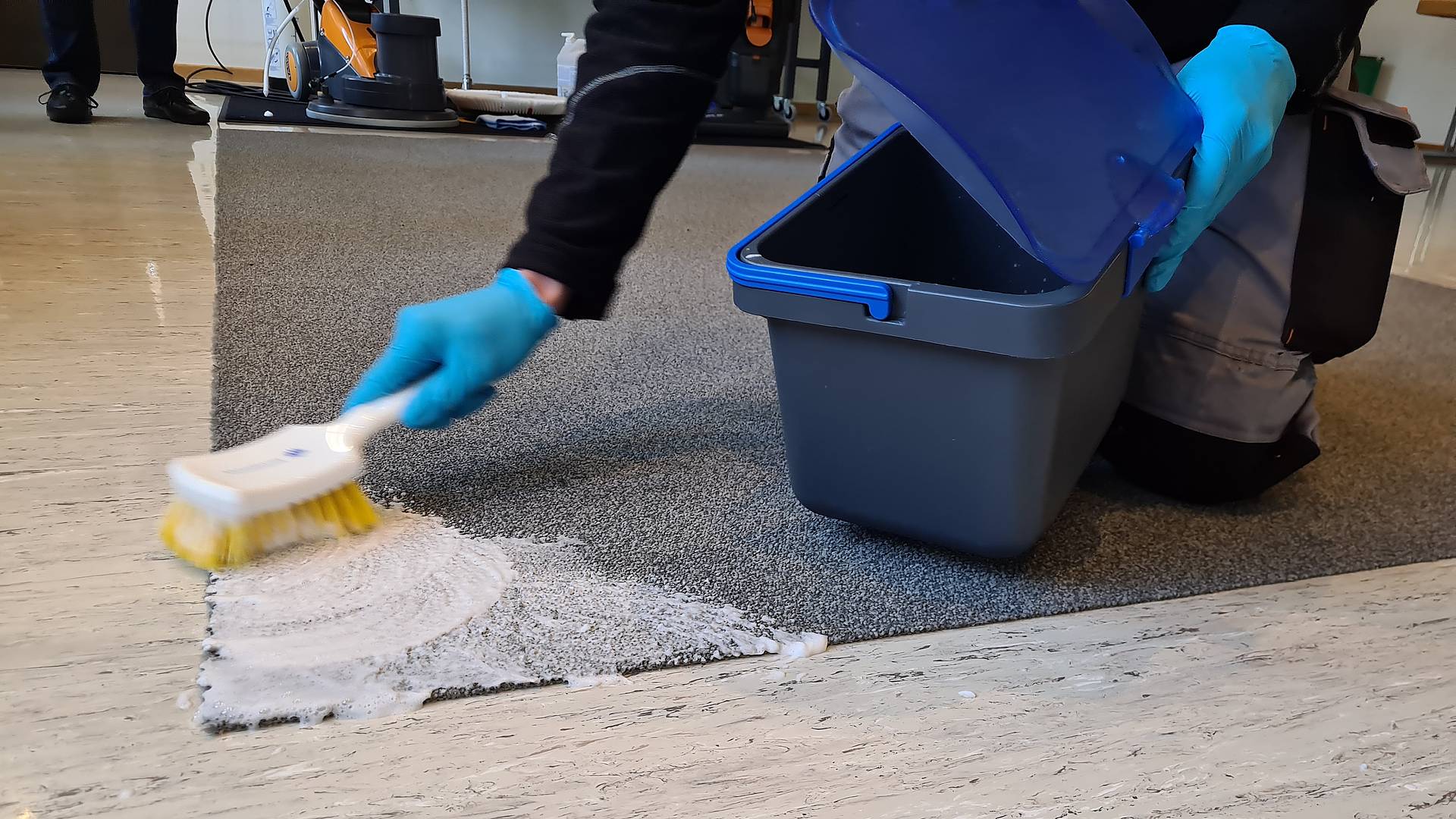 «Wir haben den Tag vollbepackt mit praktischen Aufgaben, damit ihr euren Rucksack für die Prüfung füllen könnt», so Hirzel. Behandelt werden dieselben Programmpunkte wie an der eidgenössischen Berufsprüfung: Sprayreinigen, Trocken-Shampoonieren, Sprühextrahieren, Scheuersaugen oder die Grundreinigung von geöltem Parkett. Dieser Vorbereitungstag bewährt sich gemäss Lehrer Björn Müggler: «Wir wollen nicht nur Theorie bieten. Um die Reinigungsmethoden zu vertiefen, organisieren wir im Schulhaus Grossacker und hier bei Diversey zwei Praktika.»