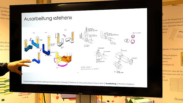 Entwurf/Modell: Im Entwurfsprozess spielen verschiedene Aspekte wie Materialkunde und Ergonomie (Biometrik, Interface, Wahrnehmungsphysiologie) eine Rolle. Diese Phase geht über die rein technische Arbeit hinaus und die Studierenden entwickeln ihre Designfähigkeiten und berücksichtigen kulturelle Aspekte. Bei der Umsetzung werden auch betriebswirtschaftliche und rechtliche Blickwinkel eingenommen. Theorieinputs aus BWL und dem Recht helfen zum Beispiel bei der Frage nach dem Urheberrecht.