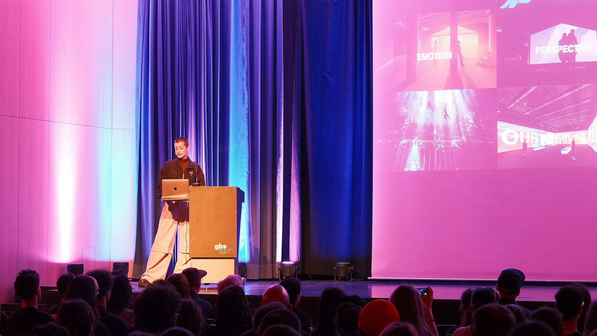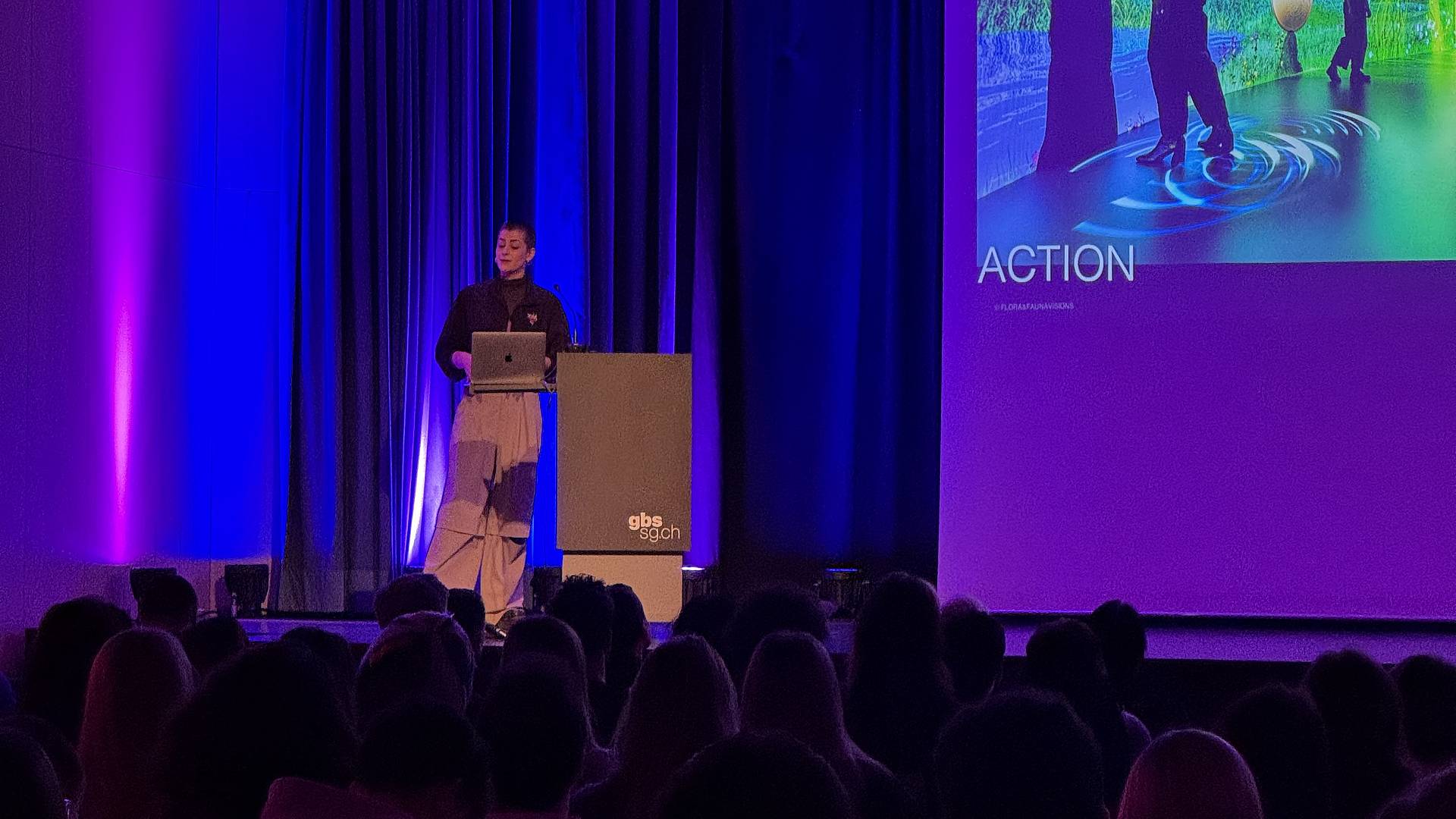 Manuel Fischer vom Zürcher Ozelot Studios richtete sich direkt an die anwesenden Interactive Media Designer/-innen EFZ des GBS St.Gallen, die HF-Studierenden der Schulen für Gestaltung in St.Gallen und Zürich sowie die Designklasse des CSIA Lugano: «Ihr habt eine echte Superkraft: Ihr kennt die aktuellen technischen Möglichkeiten genau und wisst, wie ihr sie gezielt einsetzt, um eure Generation zu erreichen, Aufmerksamkeit zu wecken und Interesse zu erzeugen.»
