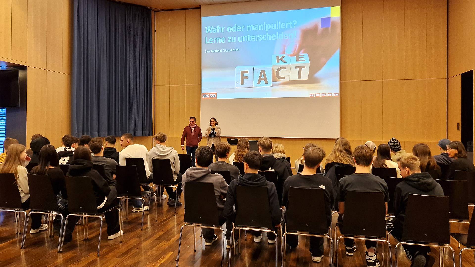 Wahr oder manipuliert? Die beiden Journalisten Sara Leuthold und Pascal Nufer führten mit mehreren ABU-Klassen einen Workshop über Fake News durch. Ihre wichtigste Botschaft an die Lernenden: Denkt mit, hinterfragt was euch angezeigt wird und recherchiert selbst.