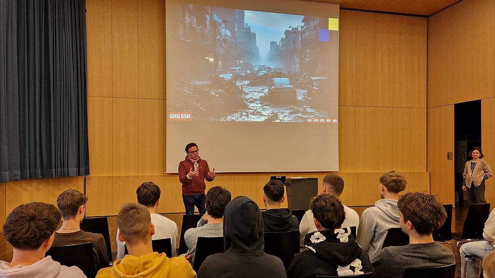Überflutete Strassen in einer Grossstadt. Das Bild, das Pascal Nufer den Lernenden in der Aula des GBS St.Gallen einblendete, liess beim ersten Hinsehen niemanden kalt. Auf den zweiten Blick war dann doch die Mehrheit der Jugendlichen der Meinung, dass es sich um eine Fälschung handelt. «Das ist cool, dass ihr schon so weit seid und das erkennt. Das Resultat hätte vor einem halben Jahr noch anders ausgesehen», sagte Pascal Nufer, Journalismus-Dozent an der ZHAW und ehemaliger Asien-Korrespondenz fürs Schweizer Radio und Fersenehen SRF.