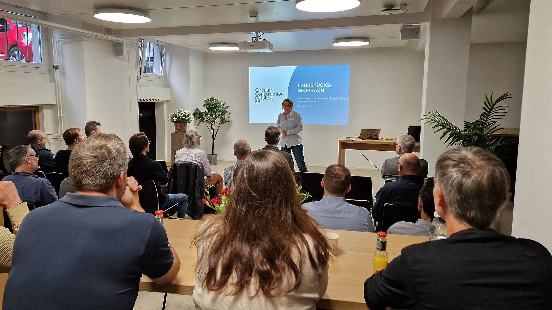 Das Bauen befindet sich im Umbruch. Die beiden Referenten des Frühstücksgesprächs, Marloes Fischer und Peter Kuhnhenn, zeigten auf, dass neue Technologien und Ideen notwendig sind, um die Kreislaufwirtschaft im Bauwesen voranzubringen. «Bereits in der Planungsphase sollte die gesamte Wertschöpfungskette stärker mitgedacht werden», sagt Marloes Fischer, Geschäftsführerin von Circular Hub und Vorstandsmitglied von C33 – Schweizer Koordinationsstelle für zirkuläres Bauen. Die Branche sei gefordert, gewohnte Denkmuster zu hinterfragen und alltägliche Prozesse neu zu betrachten.