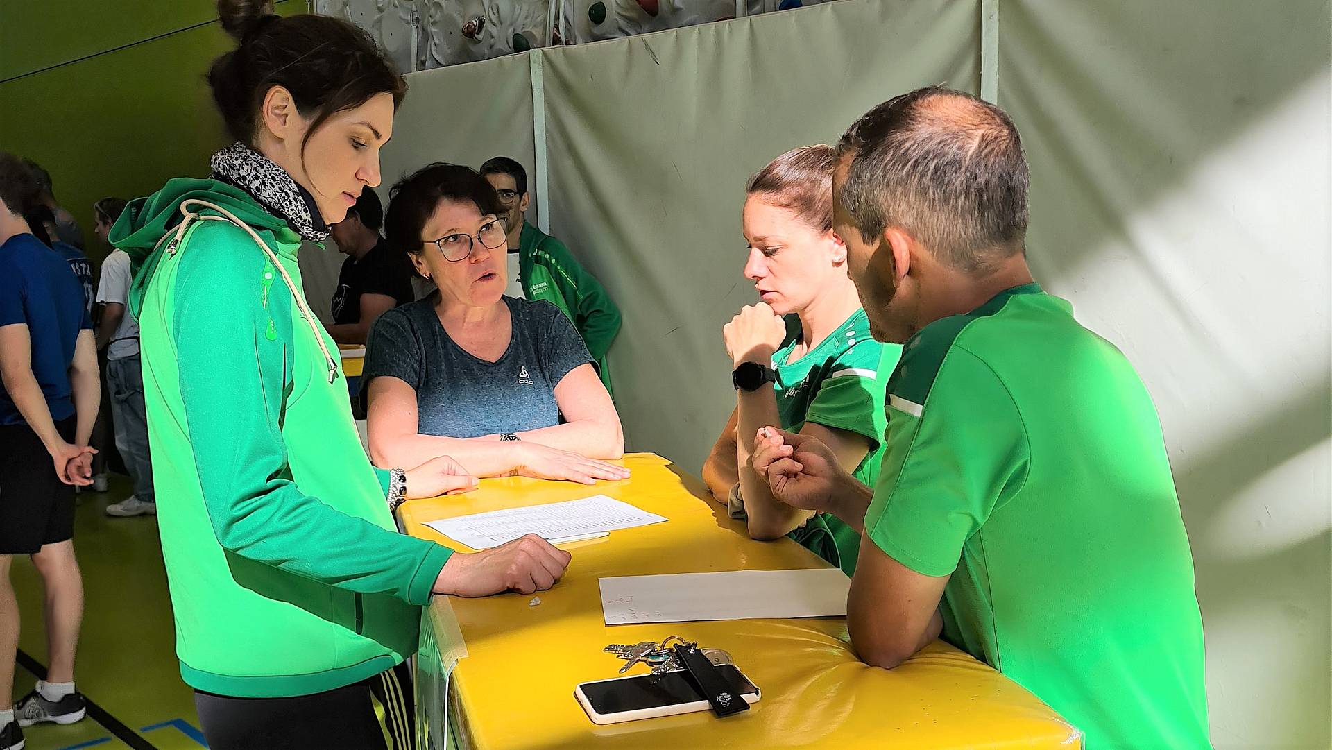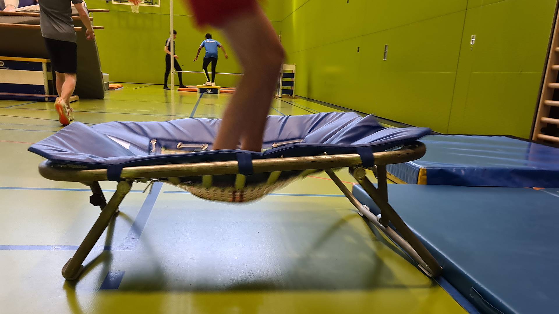 An der Sprossenwand der Sporthalle Tal der Demut wird eine grosse Matte mit Seilen befestigt. Davor sind zwei kleinere Matten und ein Trampolin platziert. Alles ist bereit für den grossen Katzensprung, dem beidbeinigen Absprung vom Trampolin. Anschliessend setzen Beine und Arme gleichzeitig an der Sprossenwand auf. Es folgt der Absprung in einer 180-Grad-Drehung.