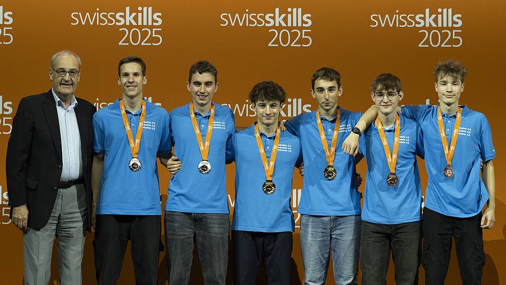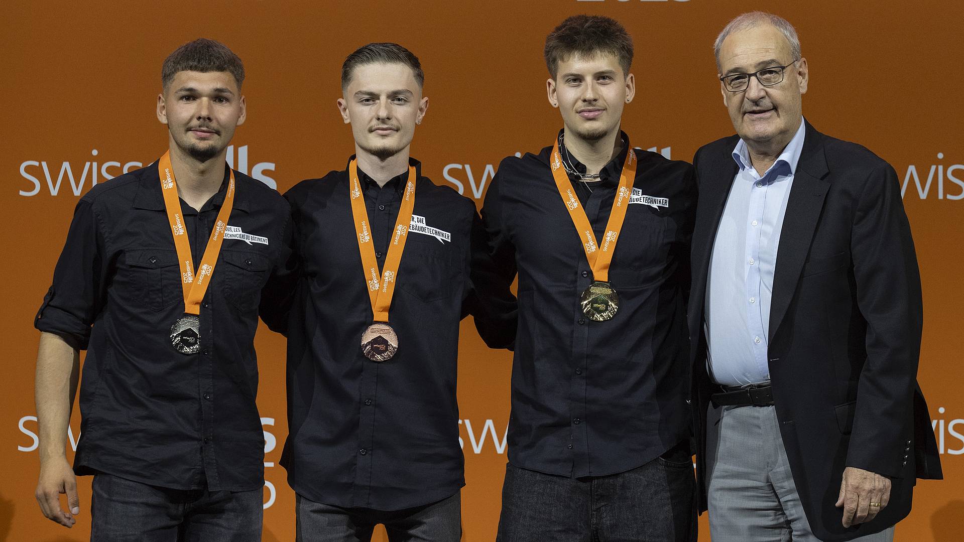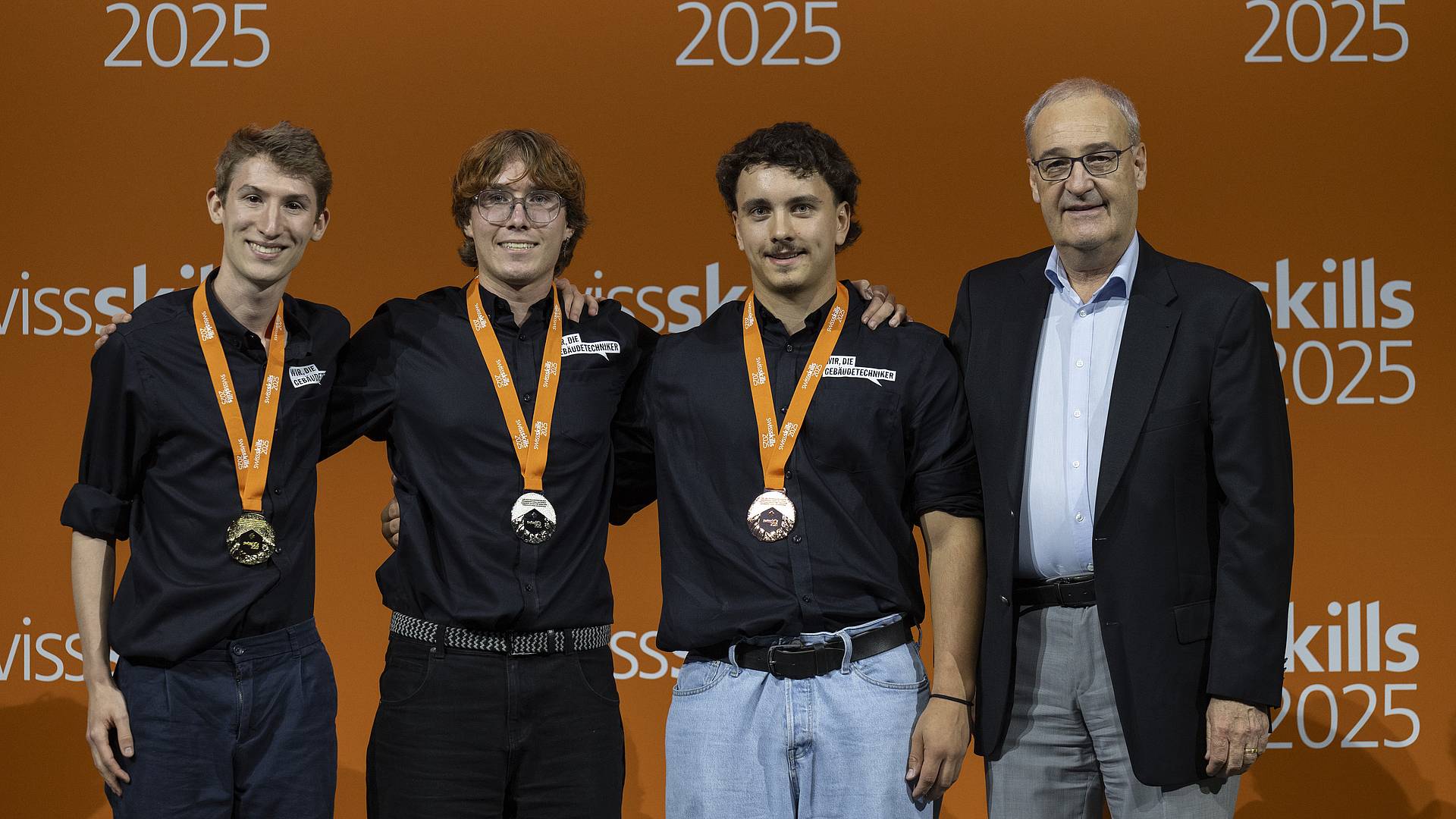 Ben Wild (Gebäudetechnikplaner Heizung, Calorex AG), Tiffany Victoria Di Nunzio (Interactive Media Designerin, ETH Zürich), Niklas Daniel und Joas Konrad (beide Industry 4.0, Bühler AG) freuten sich über Bronze. Wirtschaftsminister Guy Parmelin lobte alle SwissSkills-Teilnehmende: «Ihre Fähigkeiten sind ein Versprechen für die Zukunft. Leidenschaft, Können, Berufsstolz – das ist das, was uns in den letzten Tagen bewegt hat.» Die Berufsbildung sei ein Pfeiler des Erfolgsmodells Schweiz.