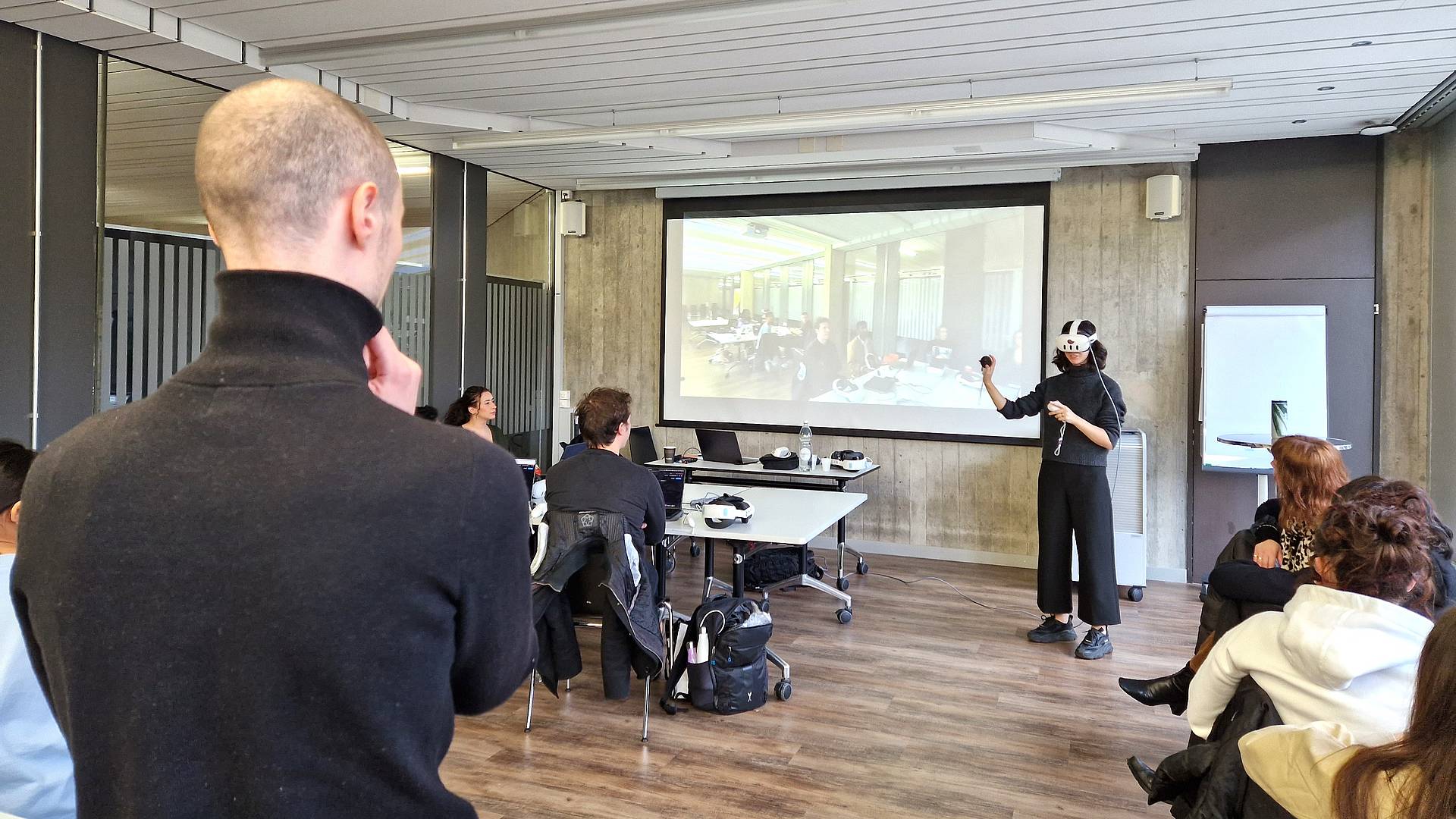 Manuel Bonell sagt über die Arbeit von Immerea: «Unsere Vision ist es, Projekte von hoher künstlerischer Qualität und mit experimentellem Ansatz zu schaffen, die die Grenzen immersiver und interaktiver Technologien erweitern.» Den angehenden Interactive Media Designer/-innen EFZ erklärte Flavia Mazzanti: «Der virtuelle Raum kann genutzt werden, um andere Realitäten und Räume zu entdecken. Wir können eine Parallelwelt entwickeln.»