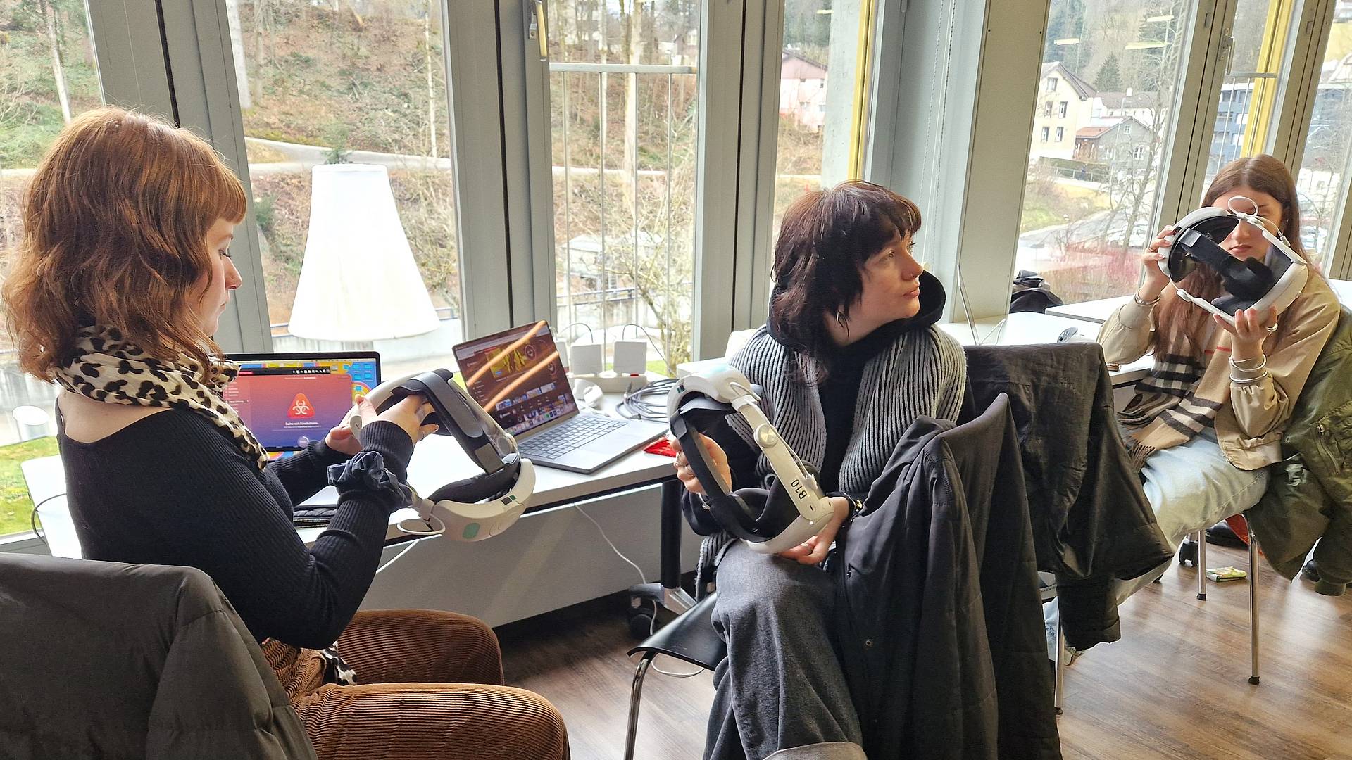 Nach dem Mittagessen inspirierte das Immerea-Duo die Lernenden dazu, neue Ideen zu entwickeln, wie sie ihre Abschlussarbeiten diesen Sommer präsentieren wollen. Den Besucher/-innen der Ausstellung soll ein Erlebnis geboten werden, das über die Betrachtung des physischen Objekts hinausgeht. «Ich weiss jetzt noch nicht, welche Effekte ich umsetzen will, aber wenn uns schon die Anwendung von Mixed Reality gefällt, wird sie auch den Besuchenden gefallen», sagt Kimberly.