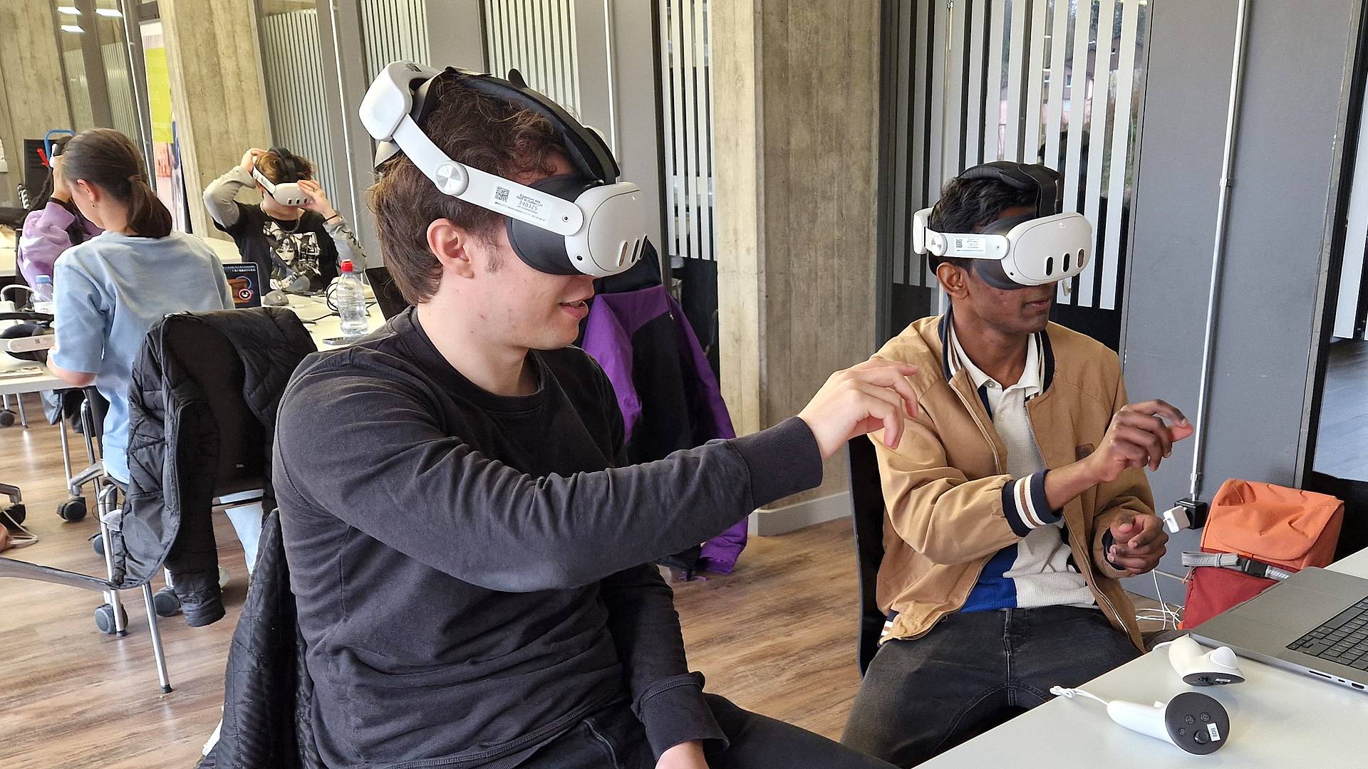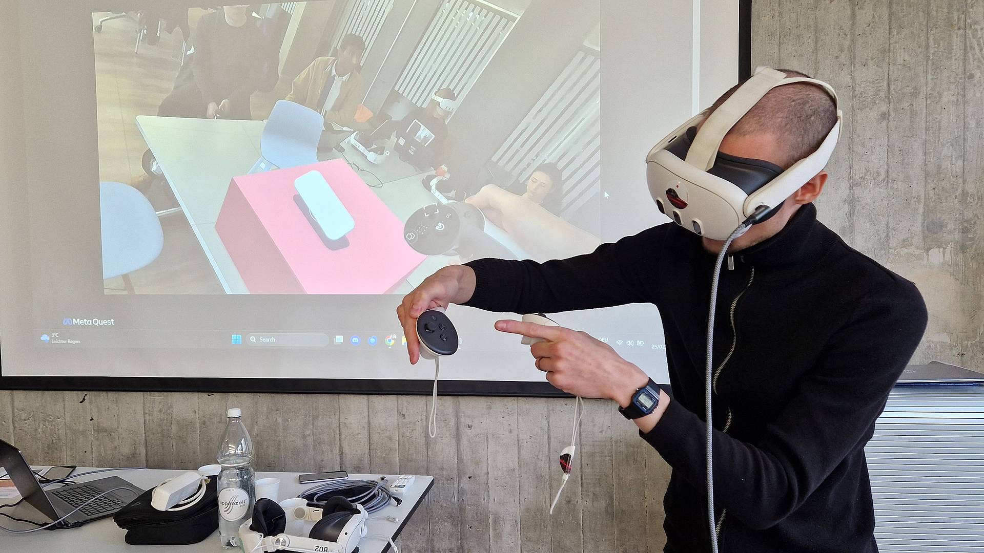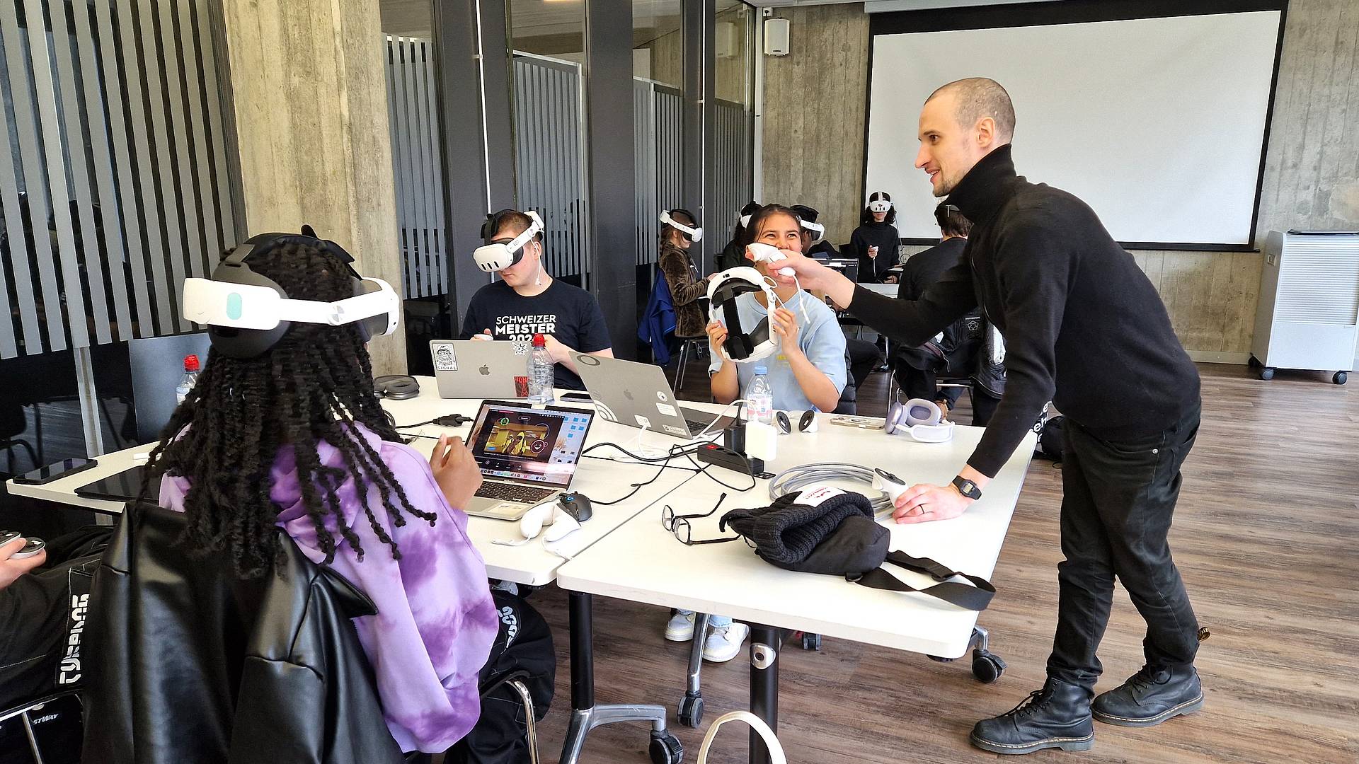 Flavia Mazzanti und Manuel Bonell unternahmen mit den Lernenden am Vormittag des Workshops erste Gehversuche mit Shapes XR. Mit der Software können Nutzende in einem immersiven 3D-Raum Modelle, Entwürfe und Prototypen erstellen sowie in Echtzeit gemeinsam bearbeiten. Die Vorteile liegen für Manuel Bonell auf der Hand: «Es gibt viele Tools, aber dieses hier verlangte keine Programmierkenntnisse und hat alles, was wir als Interactive Media Designer/-innen brauchen.»