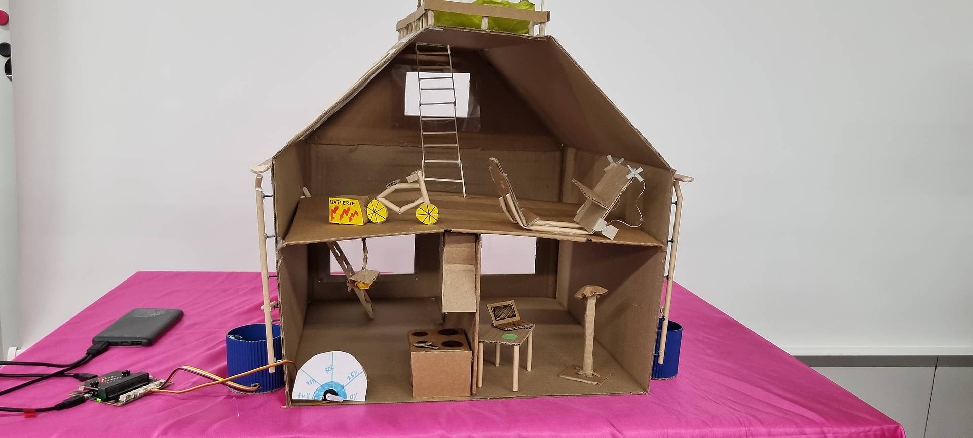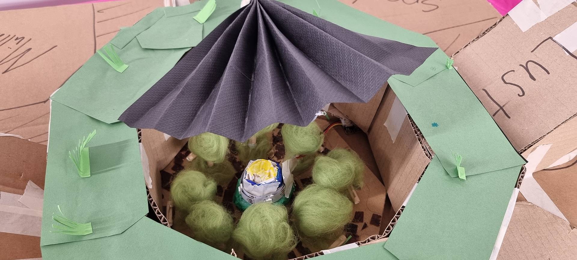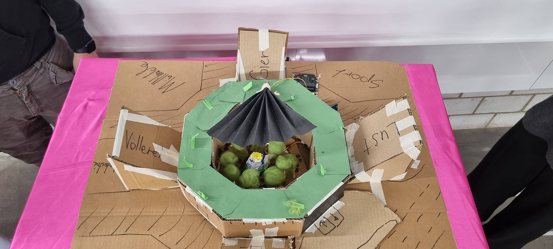 Zu Beginn wurden Lösungsansätze entwickelt und diese in Form eines analogen Prototyps aus Karton umgesetzt. Mittels Sensoren und Aktoren wurden die Prototypen technologisiert, um die eigenen Lösungsansätze technisch umzusetzen.