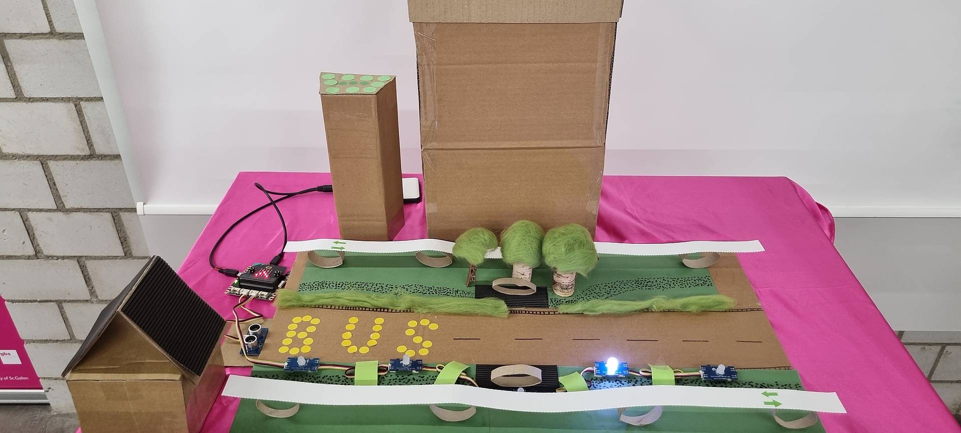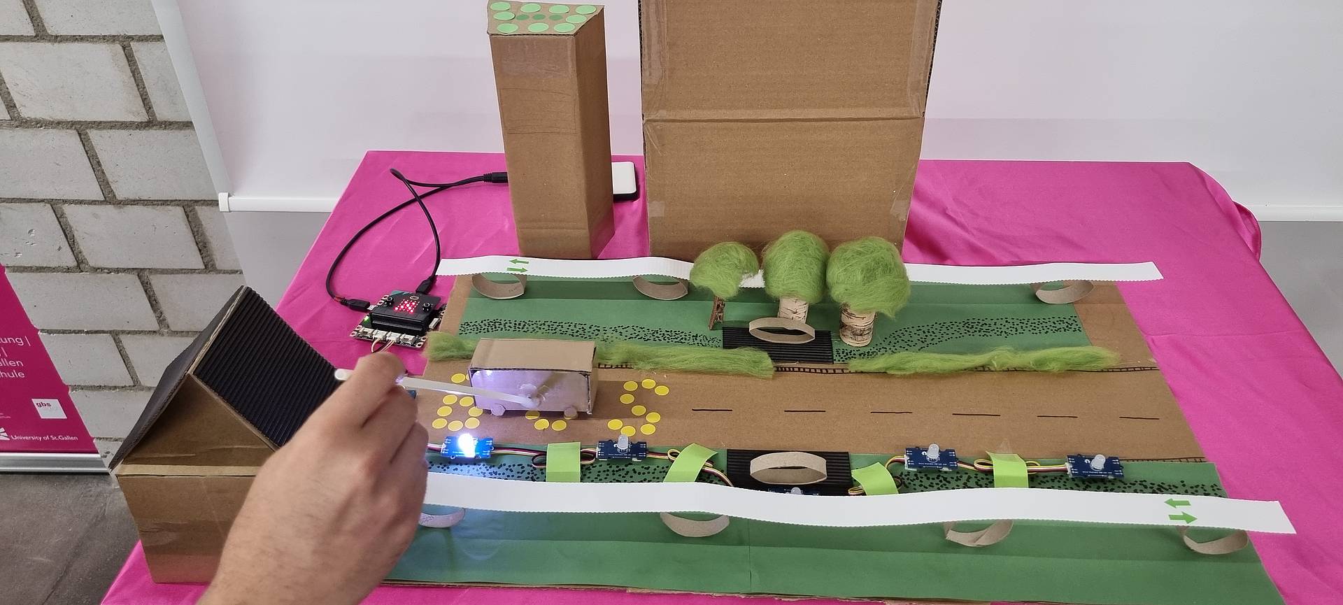 Strasse mit Strassenlaternen, welche mit Bewegungssensoren ausgestattet sind, und nur dann, wenn ein Bus/Auto vorbei fährt leuchtet. Entlang der Strasse führen Fahrrad- und Fussgängerwege. Dieses Modell wird am GBS St.Gallen in der Mediothek der Berufsmaturitätsschule in der Davidstrasse ausgestellt.