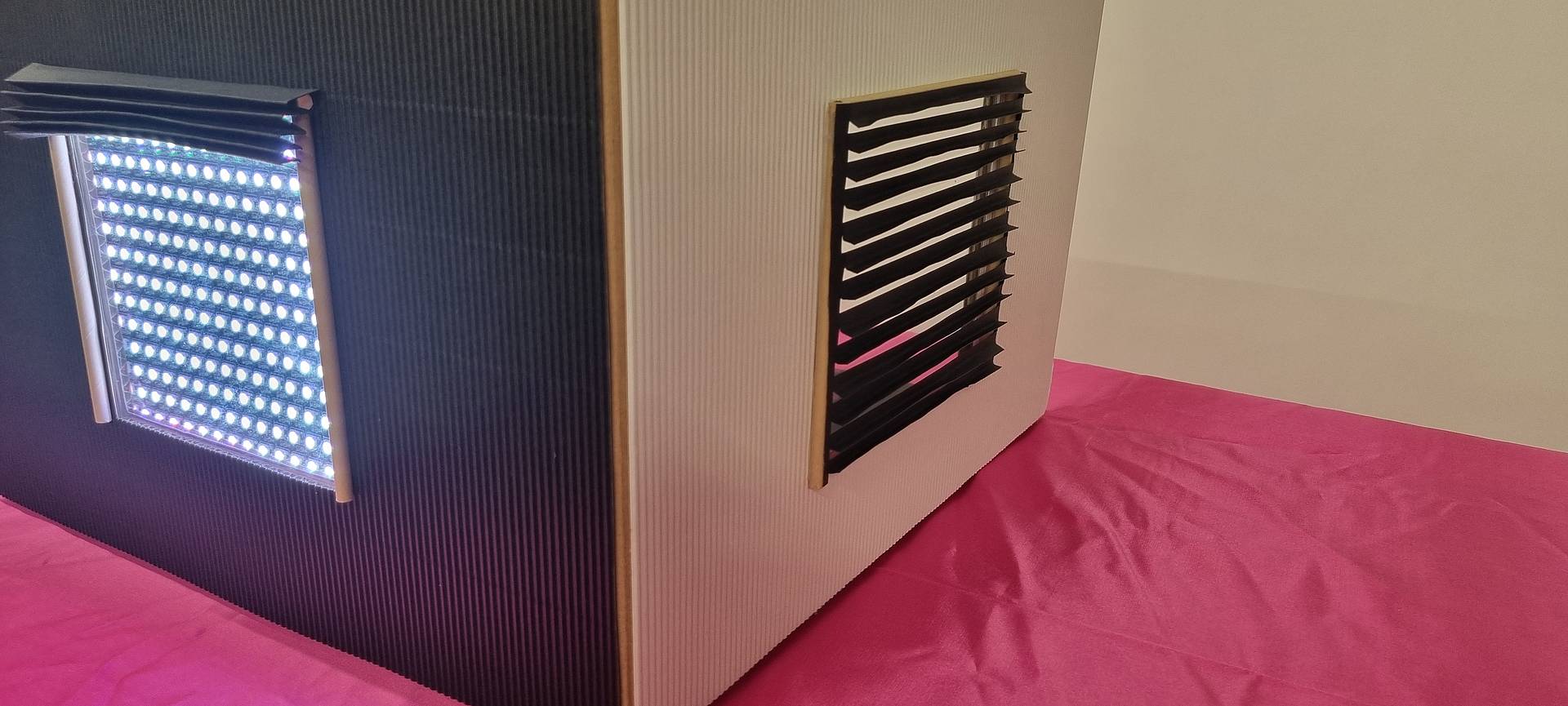 Haus mit einer Fassade, die sich je nach Temperatur anpasst. Bei hohen Temperaturen wird sie weiss und bei kalten Temperaturen wird sie schwarz. So kann Wärmeenergie reflektiert oder absorbiert und gespeichert werden.
