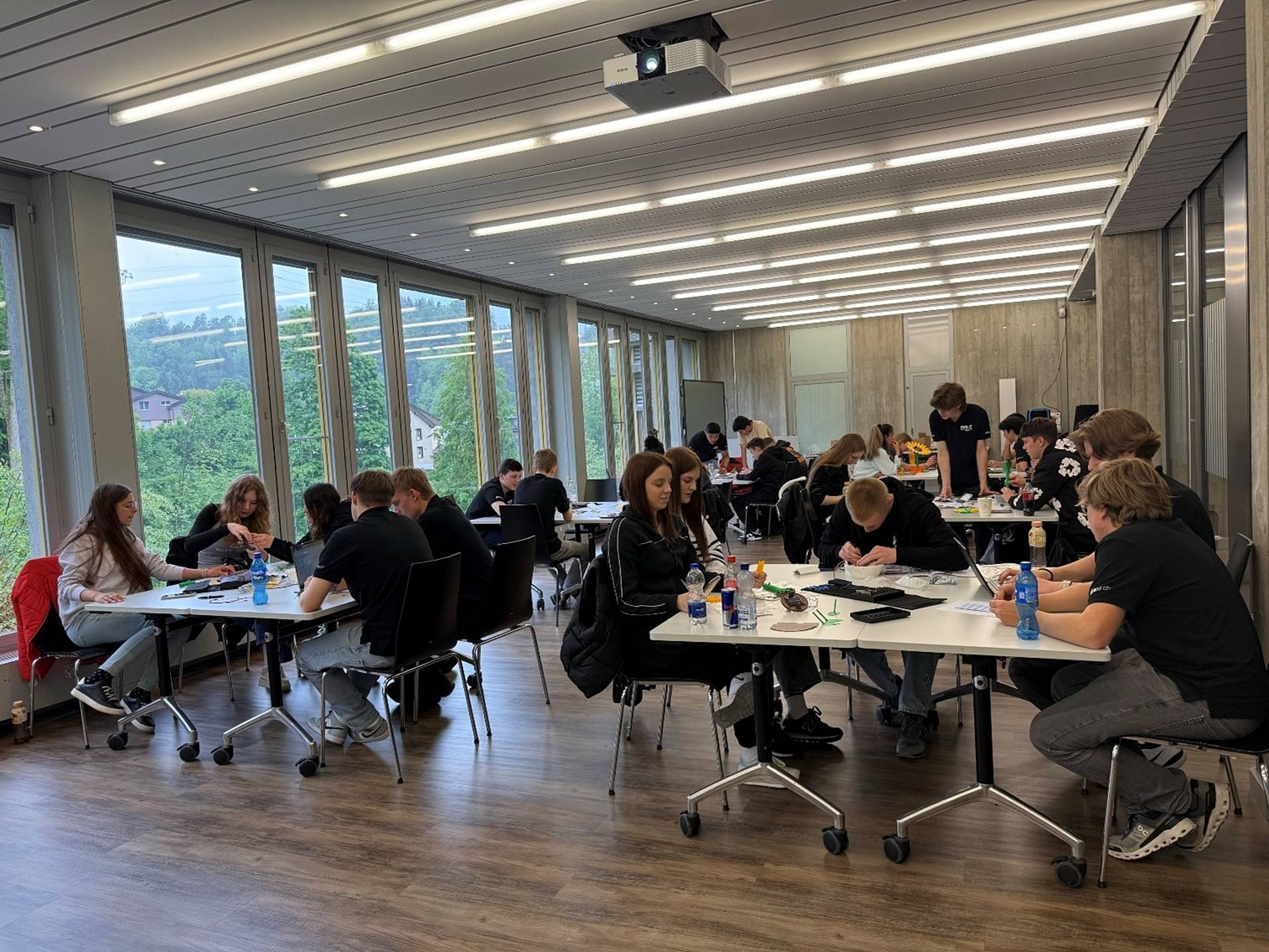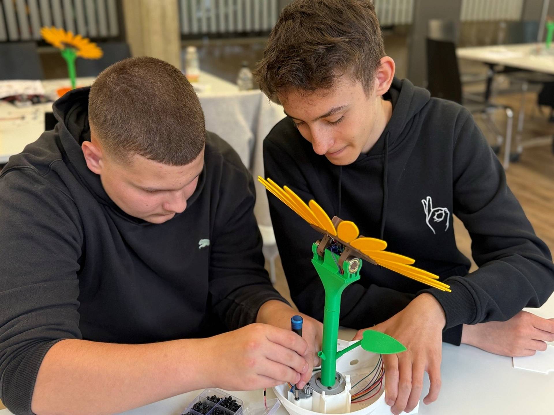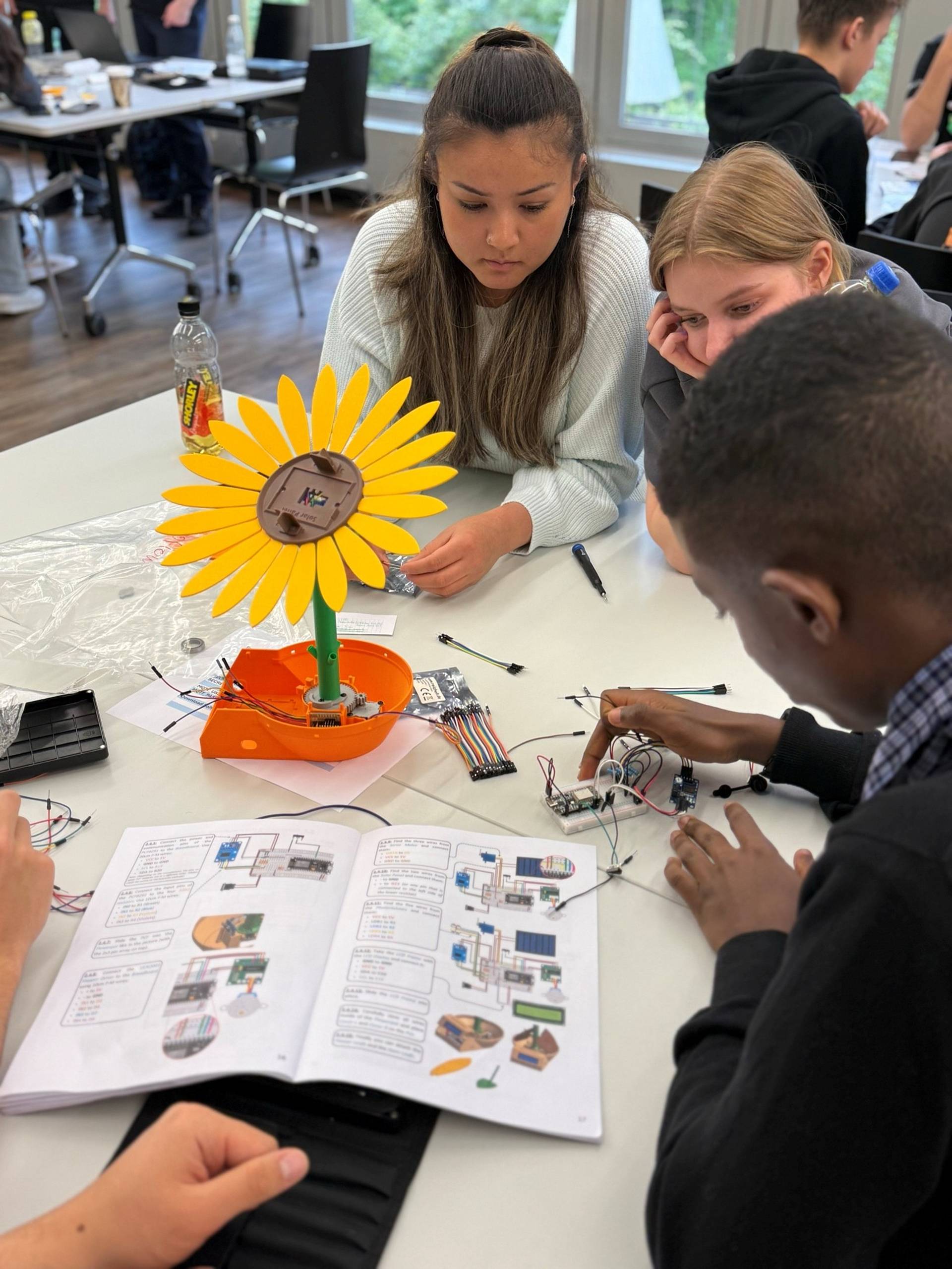 Ausserdem bauten sie im Rahmen der EduDemoS Local Student Academy im Riethüsli mit Jugendlichen der Vorlehre und der Integrationskurse eine Solarsonnenblume zusammen und nahmen diese in Betrieb. Dieser Wissenstransfer hat allen Beteiligten sichtlich Spass gemacht.